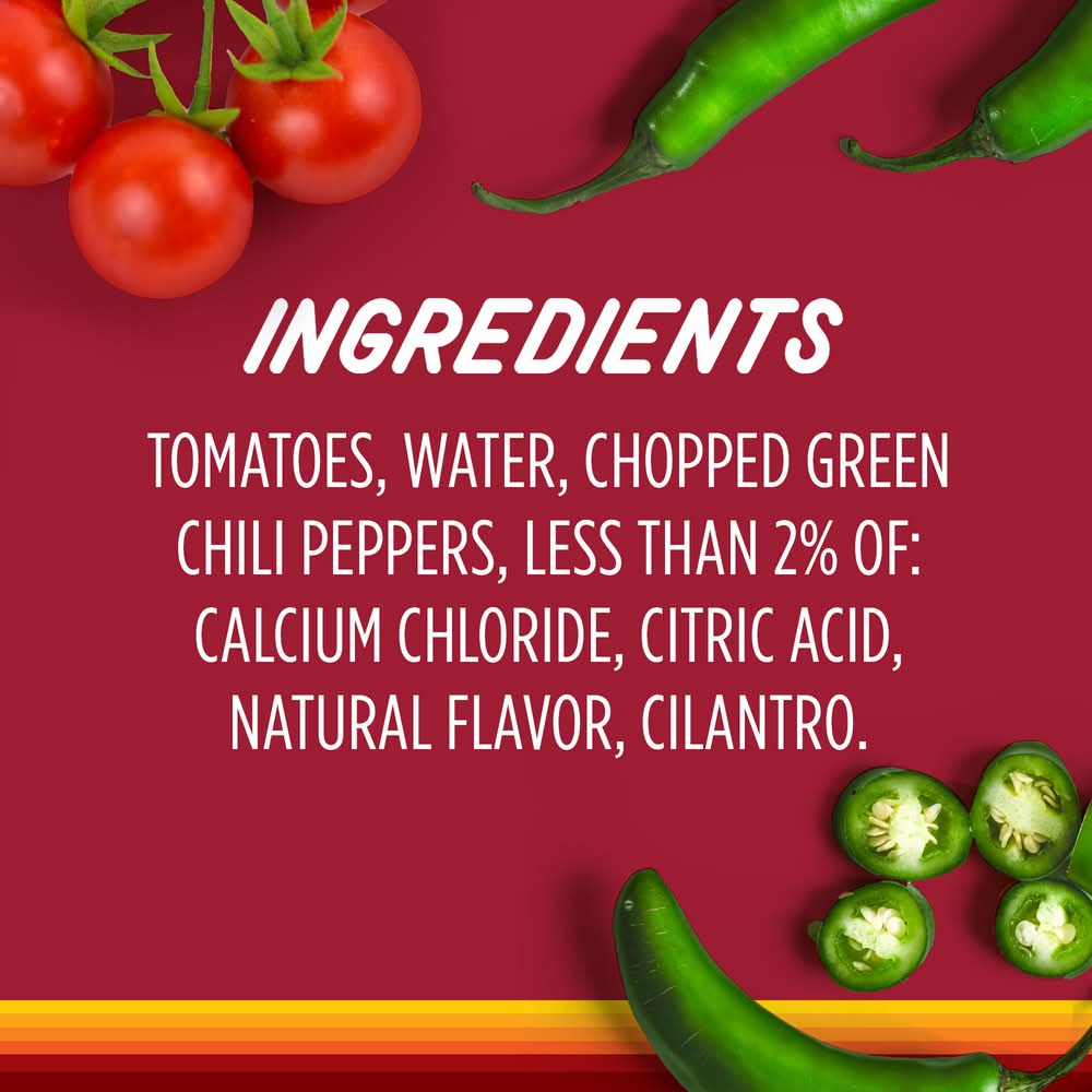 Ingredients: Tomatoes, Water, Chopped Green Chili Peppers, less than 2% of: Calcium Chloride, Citric Acid, Natural Flavor, Cilantro.