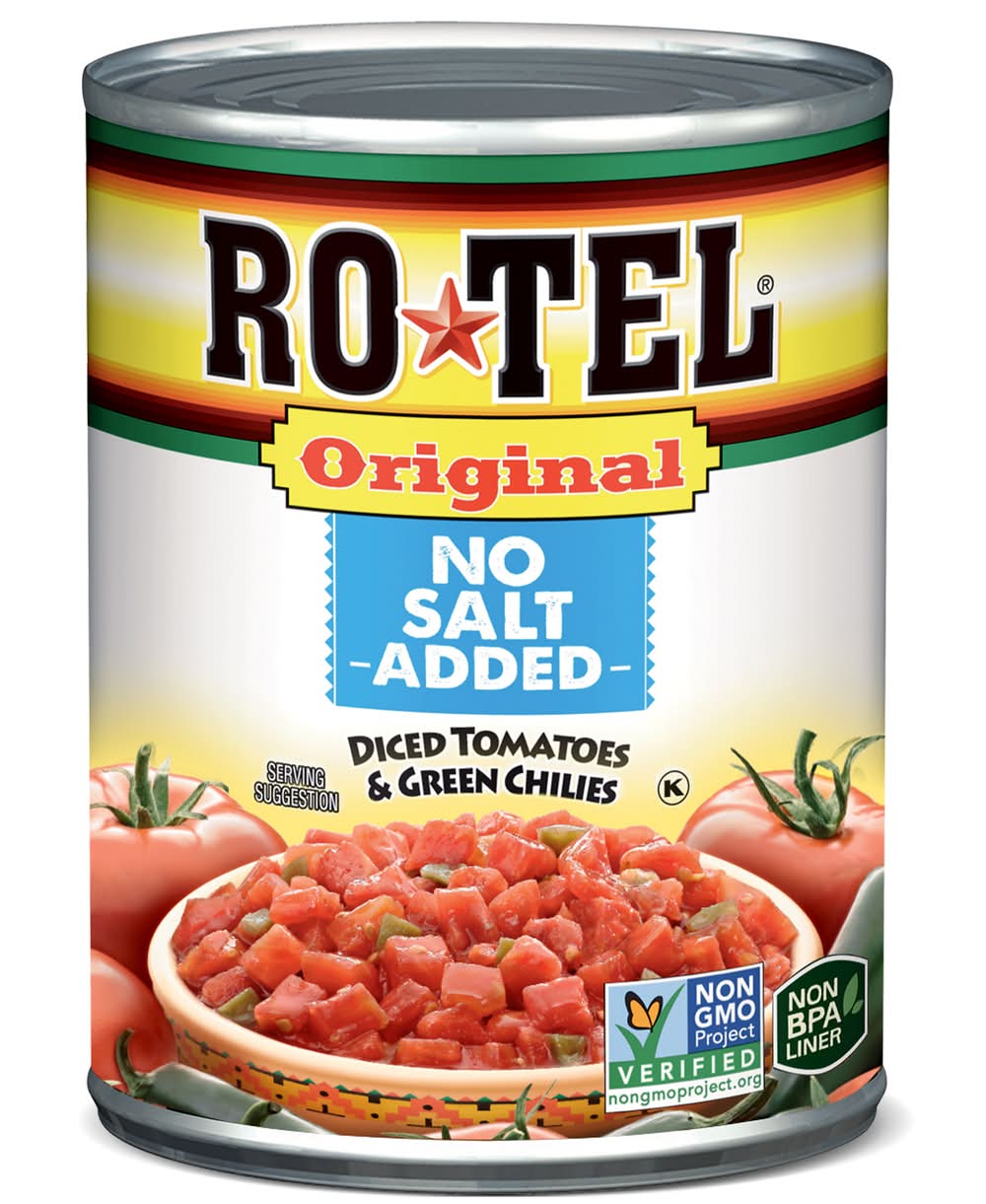 Add bold, spicy flavor to your favorite dishes with Rotel Original No Salt Added Diced Tomatoes and Green Chilies. Vine-ripened tomatoes, zesty diced green chilies and a mix of spices without added salt combine for the perfect big, bold flavor boost for all your spicy recipes. From salsa and queso dip to savory chili and Mexican-inspired favorites, add these canned tomatoes to your creations for an extra kick. They are a tasty and easy way to spice up any meal or appetizer. A true pantry staple, these diced tomatoes are must-have canned vegetables. Ready when you need it, green chilies and juicy diced tomatoes canned to ensure bold flavor. These canned diced tomatoes and green chilies are keto friendly*, fit a low carb* lifestyle, are Non-GMO Project Verified and contain 25 calories per serving, so you can add flavor without compromise. With a variety of heat levels and flavors you can find the canned tomato recipe that’s right for you. Rotel holds firmly to the belief that quality is paramount in making a great-tasting product. Rotel: Add some kick to your menu tonight. *1g of protein, 3g net carbs (5g total carbs minus 2g dietary fiber), and 0g added sugar per serving