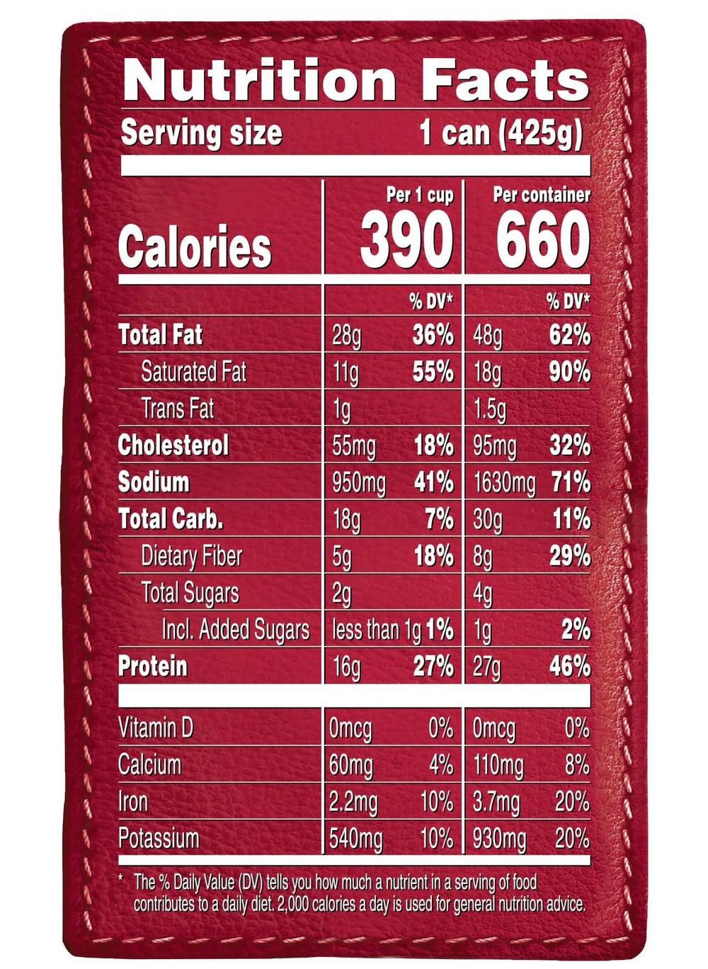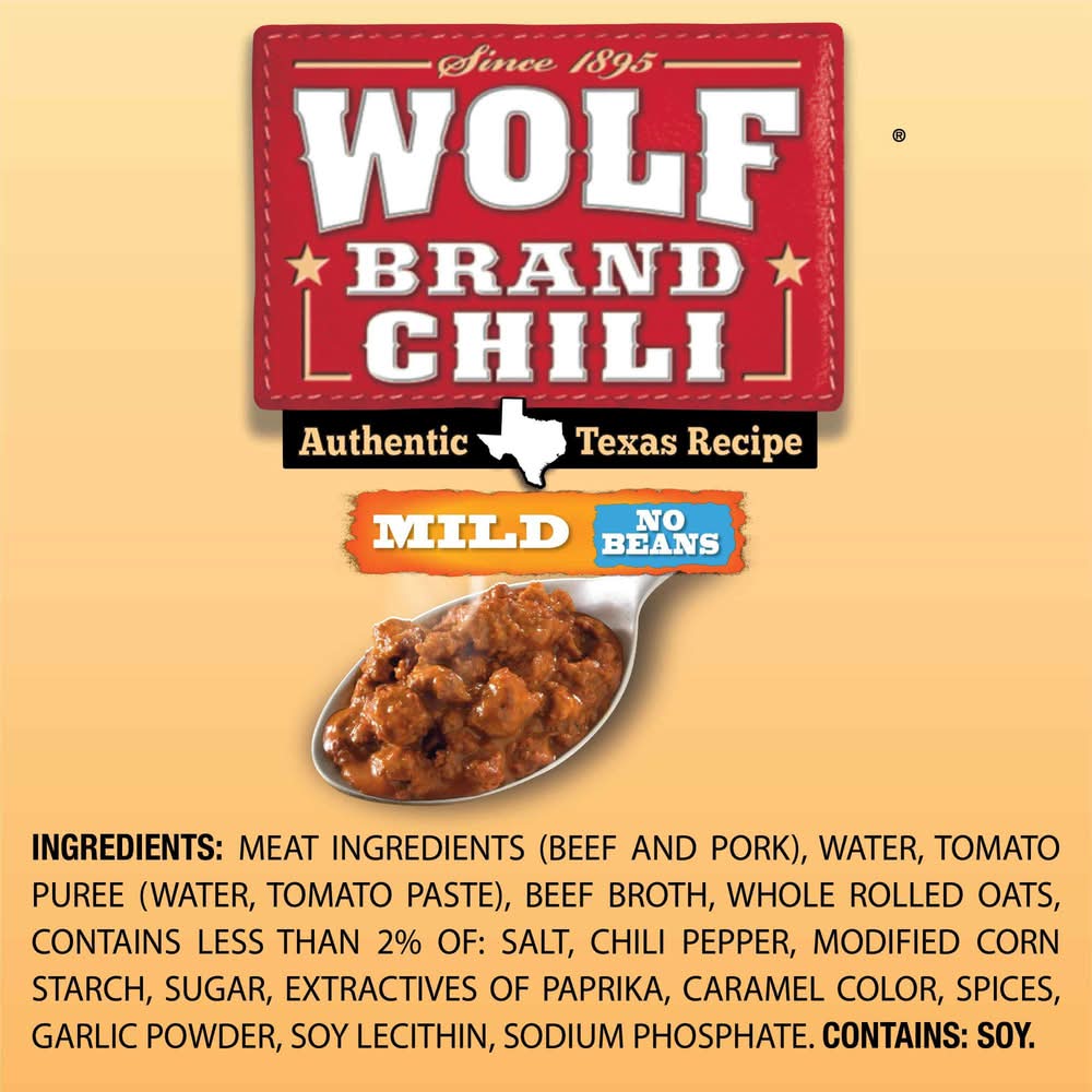 When you need to turn down the Texas heat, pick up a can of WOLF BRAND Mild Chili Without Beans. Enjoy the same bold flavor of ground beef and pork simmered in savory tomato puree, but with a mild blend of spices. This mild chili without beans tastes delicious poured over a baked potato or corn chip pie. Or serve it in a bowl with a sprinkle of cheese and a dollop of sour cream. WOLF BRAND canned chili con carne is made with no preservatives and all-natural* beef and pork, so it's an excellent source of iron per serving. Best of all, it's easy to heat up on the stovetop or in the microwave for a quick weeknight meal. The original, authentic Texas recipe dates back to 1895 with a ranch cook, Lyman T. Davis and his pet wolf, Kaiser Bill. WOLF BRAND Mild Chili Without Beans is your go-to choice for a bolder, thicker, heartier chili. *Minimally processed with no artificial ingredients Packaging: Reusable