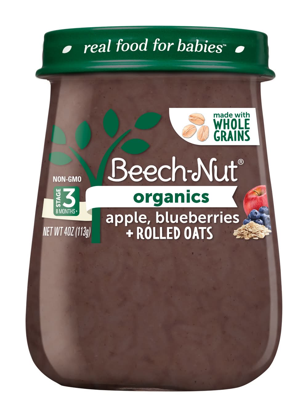 Beech-Nut Organics Apple Blueberries Rolled Oats is a baby food suitable for those aged 8 months and up. It is made with real food ingredients and carries the USDA Organic certification, verified by Oregon Tilth. This product is also non-GMO.