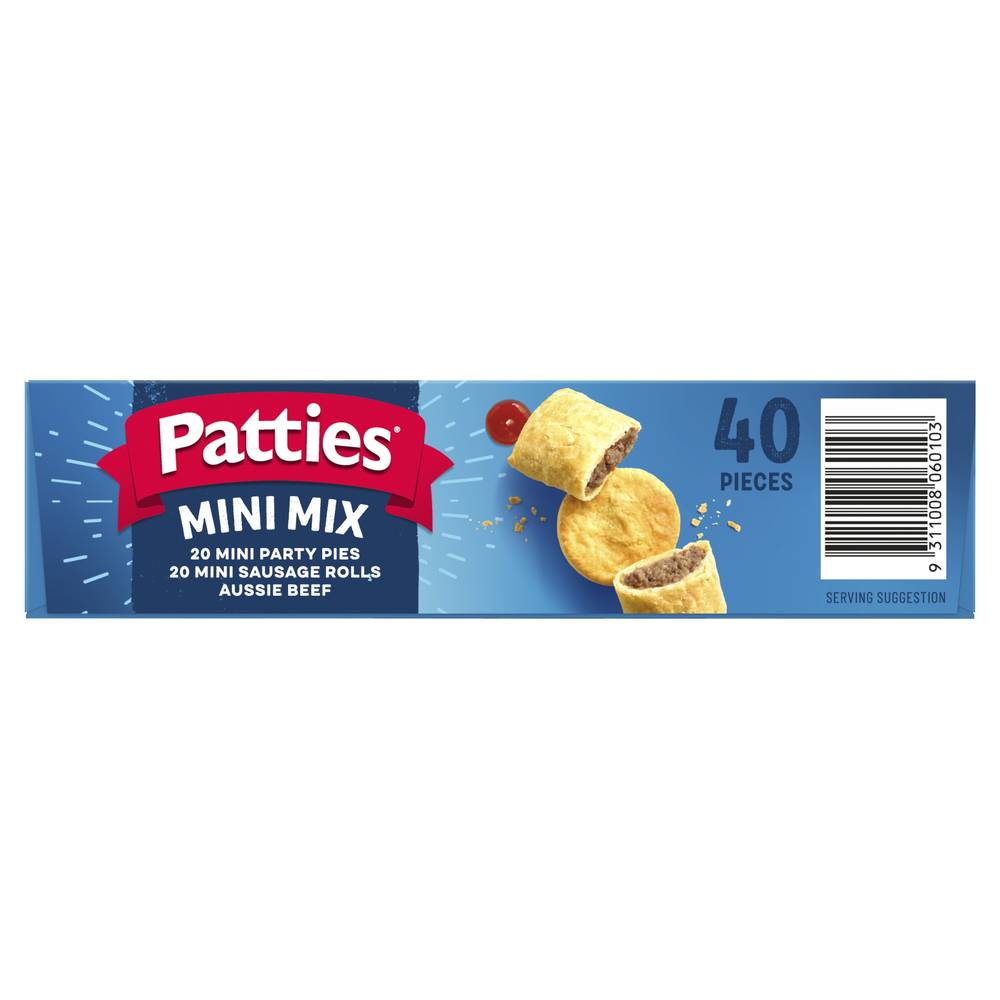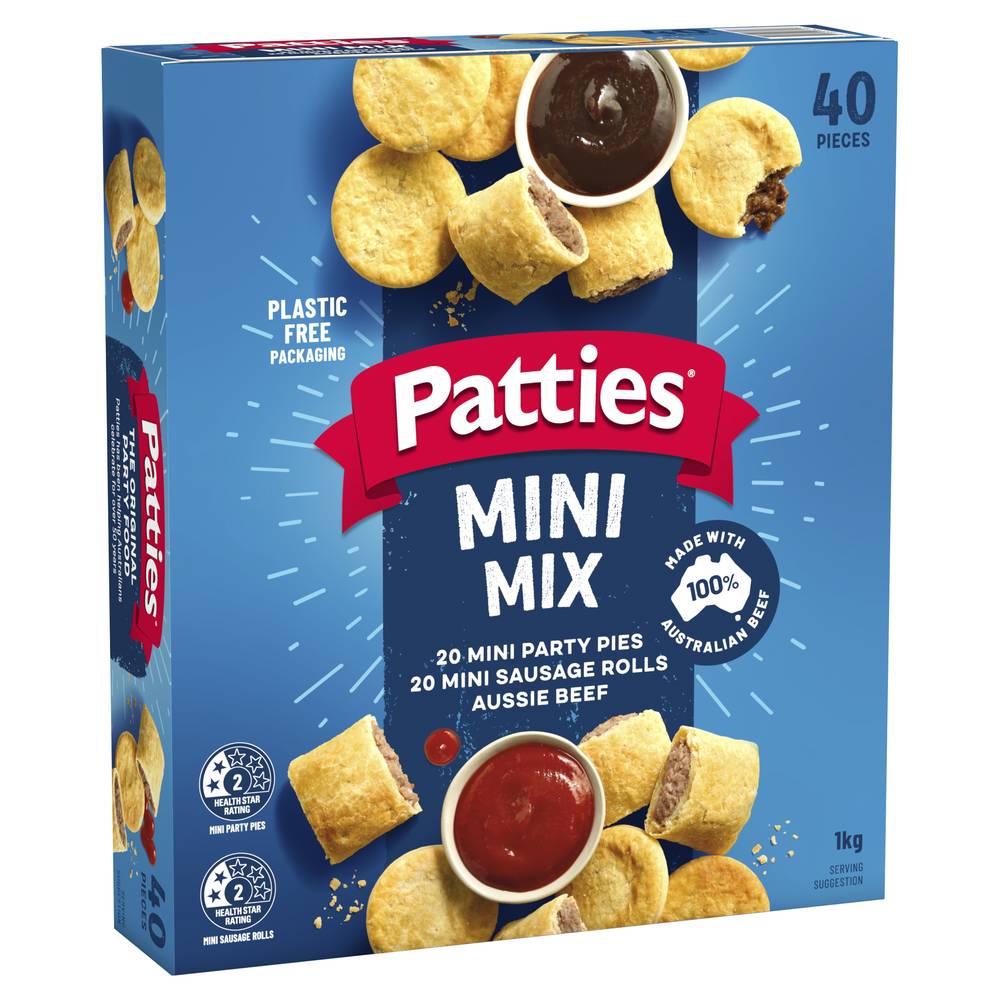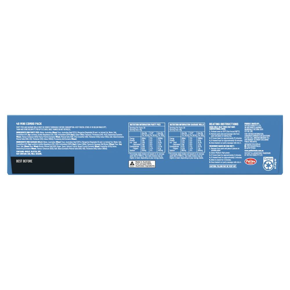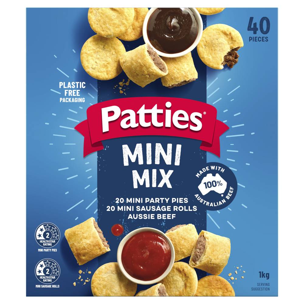 Patties Mini Combo Pack Party Pies & Sausage Rolls are a combination of our classic favourites; mini party pies & sausage rolls filled with 100% Australian beef wrapped in golden-brown flaky pastry. Packaging: Reusable