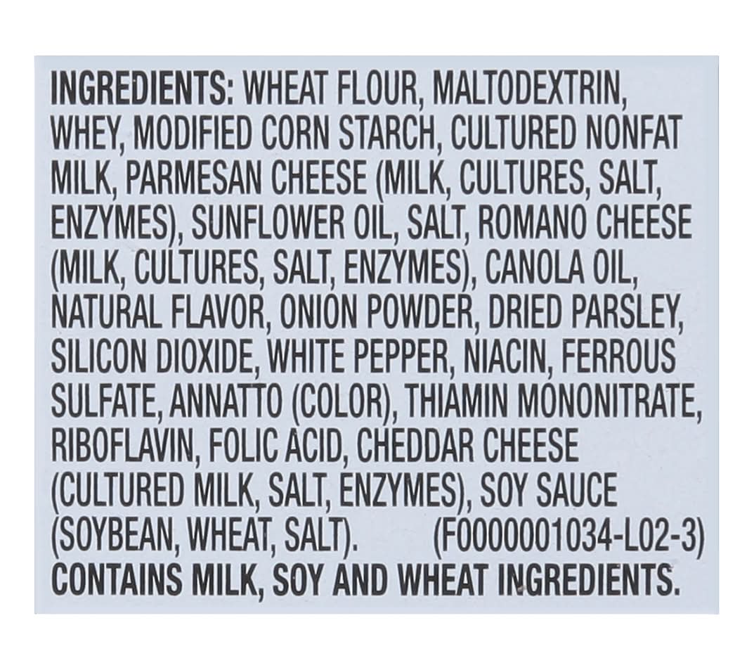 Ingredients: Wheat Flour, Maltodextrin, Whey, Modified Corn Starch, Cultured Nonfat Milk, Parmesan Cheese (Milk, Cultures, Salt, Enzymes), Sunflower Oil, Salt, Romano Cheese (Milk, Cultures, Salt, Enzymes), Canola Oil, Natural Flavor, Onion Powder, Dried Parsley, Silicon Dioxide, White Pepper, Niacin, Ferrous Sulfate, Annatto (Color), Thiamin Mononitrate, Riboflavin, Folic Acid, Cheddar Cheese (Cultured Milk, Salt, Enzymes), Soy Sauce (Soybean, Wheat, Salt) Contains: Milk, Wheat, Soybeans