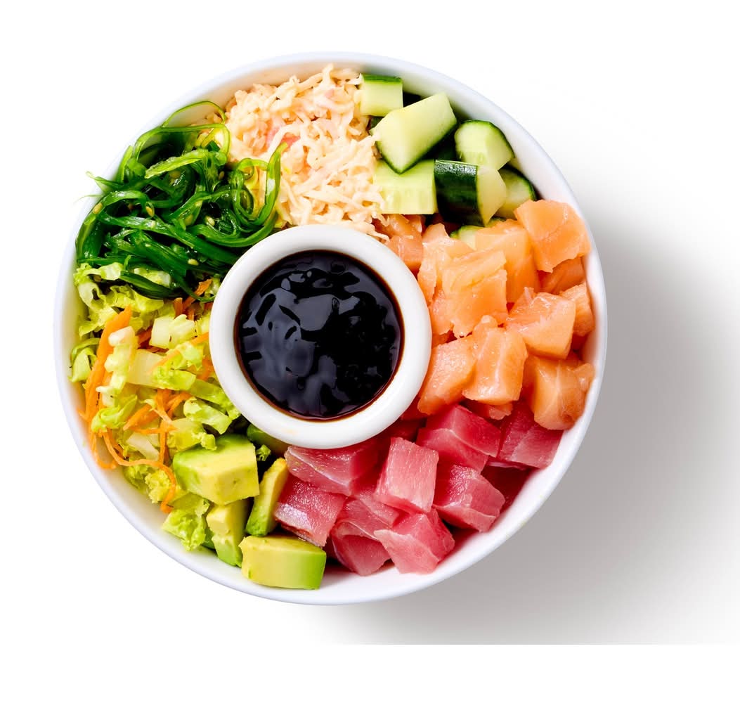 Lettuce, carrot, cucumber, imitation crab salad, seaweed salad, tuna and salmon, avocado with poke sauce. Size: 14 oz