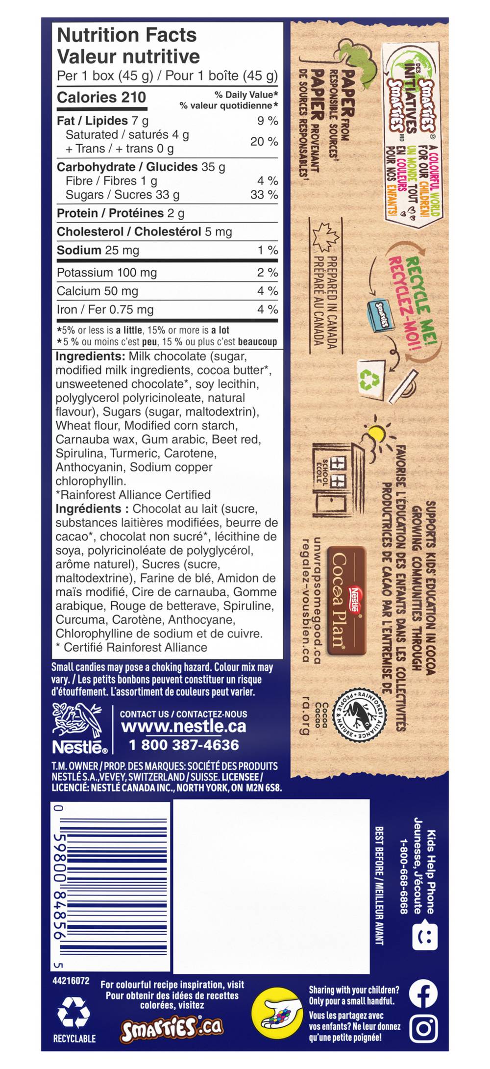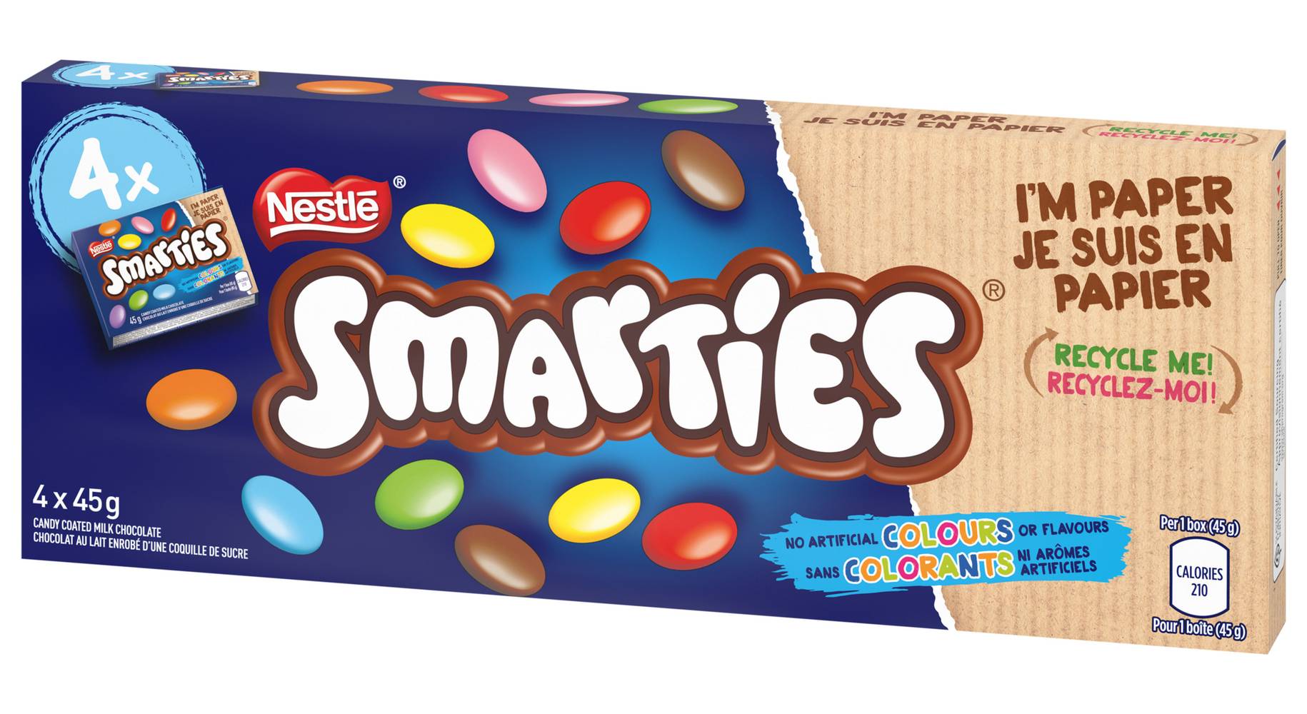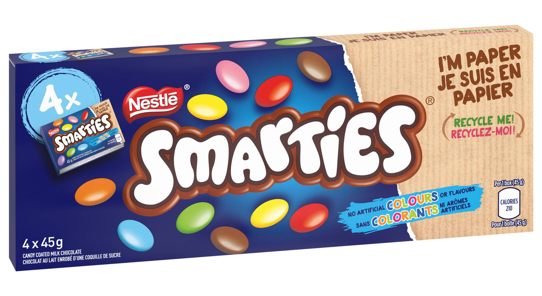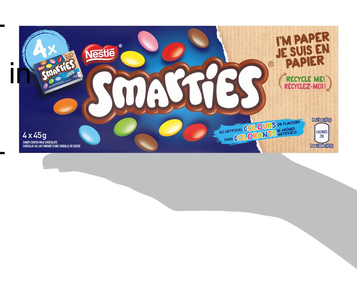 Make your day more colourful with NESTLÉ SMARTIES, 4-Pack Multipack (4 x 45 g), the Canadian favourite candy for over 80 years. Each box contains the classic, delicious combination of milk chocolate covered in vibrant candy shells. Made with sustainably sourced cocoa, these colourful delights are made with natural colours and flavours. Plus, they're produced in a peanut-free facility. And now, all SMARTIES packaging is made with paper, as part of the SMARTIES initiative to create a more colourful world for our children. This will help remove up to 26 tonnes of plastic packaging in Canada!; It's easy to share the joy of SMARTIES with family and friends, or bake them into creative, homemade treats - the possibilities are endless! The only question is, DO YOU EAT THE RED ONES LAST? • Pack size: 4 • Size: (4) x 45G