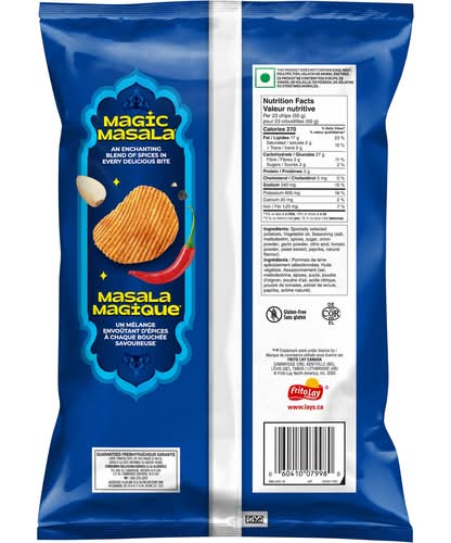Lays Magic Masala ridged flavoured potato chips spicy, flavourful, delicious ridged potato chips! Inspired by Lays Indias popular flavours, weve created a Magic Masala flavour of our very own for you to enjoy. Always Fun, Always Yum! br Snack time just isnt complete without the timeless taste of Lays potato chips! With many flavours to choose from, Canadians have been enjoying Lay's products for many years. br Lays potato chips are made with quality potatoes. Simple, wholesome and real. After carefully washing, peeling and slicing the potatoes, we cook them until they are perfectly crispy, creating the wonderful potato chips that Canadians know and love. br Whichever flavour you choose, you can always count on our delicious potatoes, so you get that perfect, crispy chip every time you reach for Lays. Lays Magic Masala ridged flavoured potato chips are no exception! • Flavor: Magic masala • Color: Magic masala