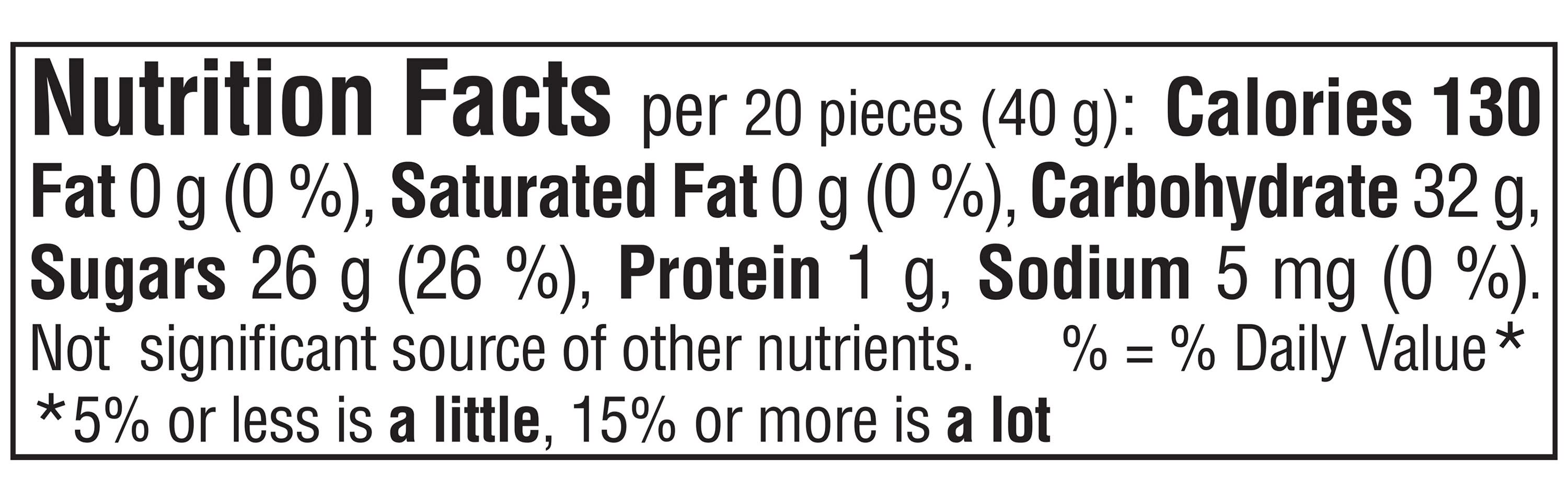 Ingredients: Sugars (corn syrup, sugar), Modified corn starch, Water, Gelatin, Citric acid, Malic acid, Natural and artificial flavours, Carnauba wax, Allura red, Tartrazine, Sunset yellow FCF, Brilliant blue FCF.