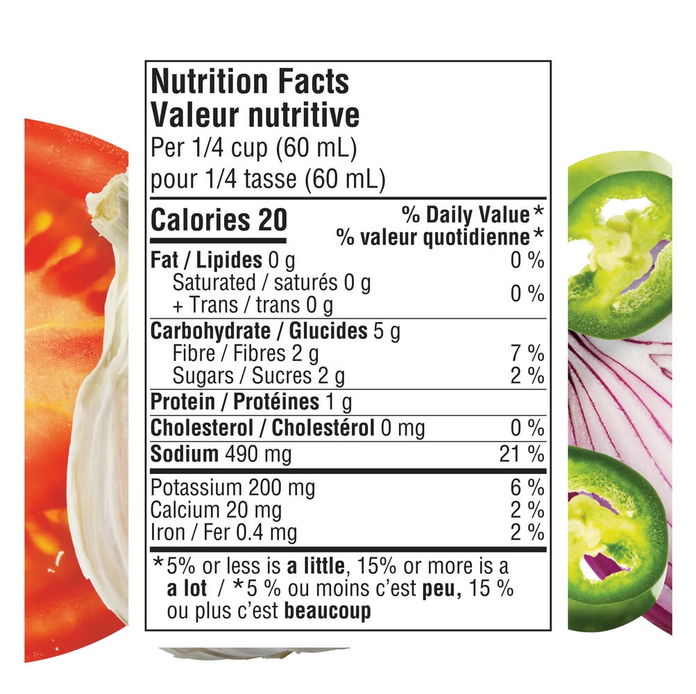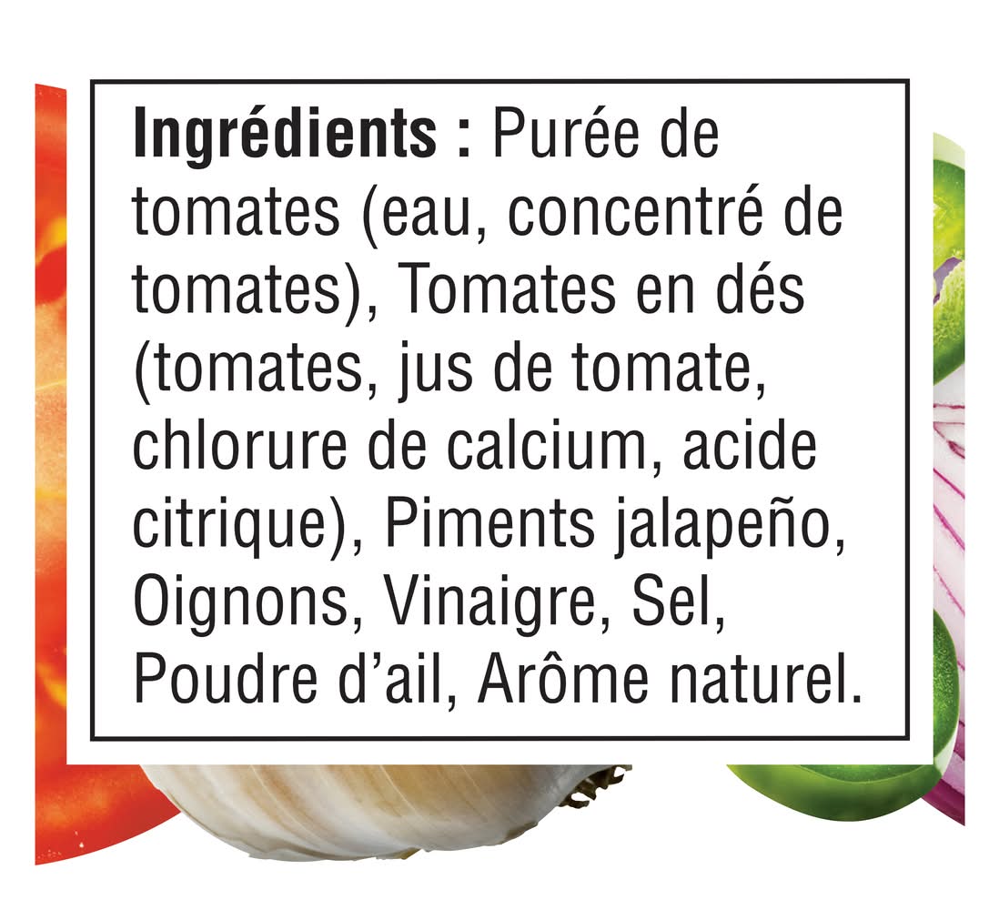 Ingredients: Tomato puree (water, tomato paste), Diced tomatoes (tomatoes, tomato juice, citric acid, calcium chloride), Onions, Jalapeño peppers, Vinegar, Salt, Potassium chloride, Garlic powder, Natural flavour.