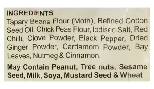 Ingredients: Tapary Beans Flour (Moth), Refined Cotton Seed Oil, Chick Peas Flour, lodised Salt, Red Chilli, Clove Powder, Black Pepper, Dried Ginger Powder, Cardamom Powder, Bay Leaves, Nutmeg & Cinnamon Contains: Peanut, Tree nuts, Sesame Seed, Milk, Soya, Mustard Seed & Wheat