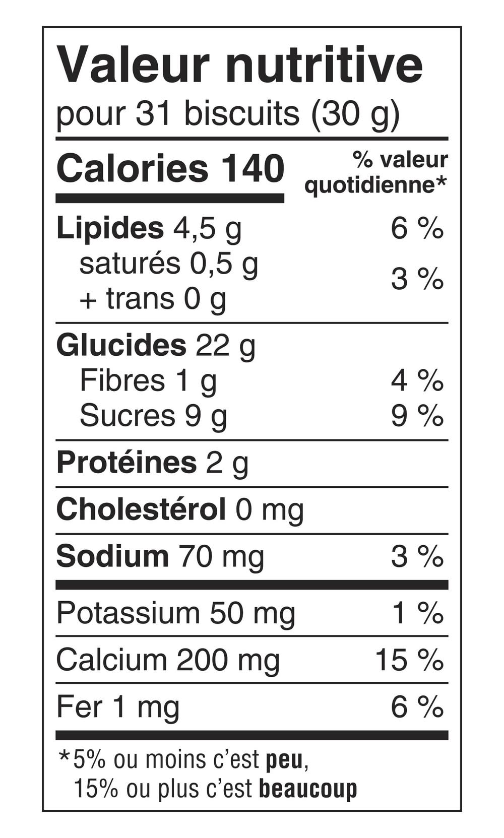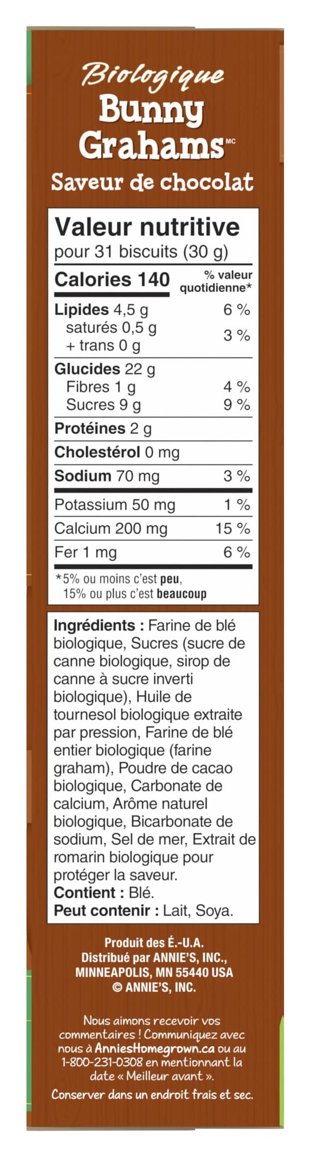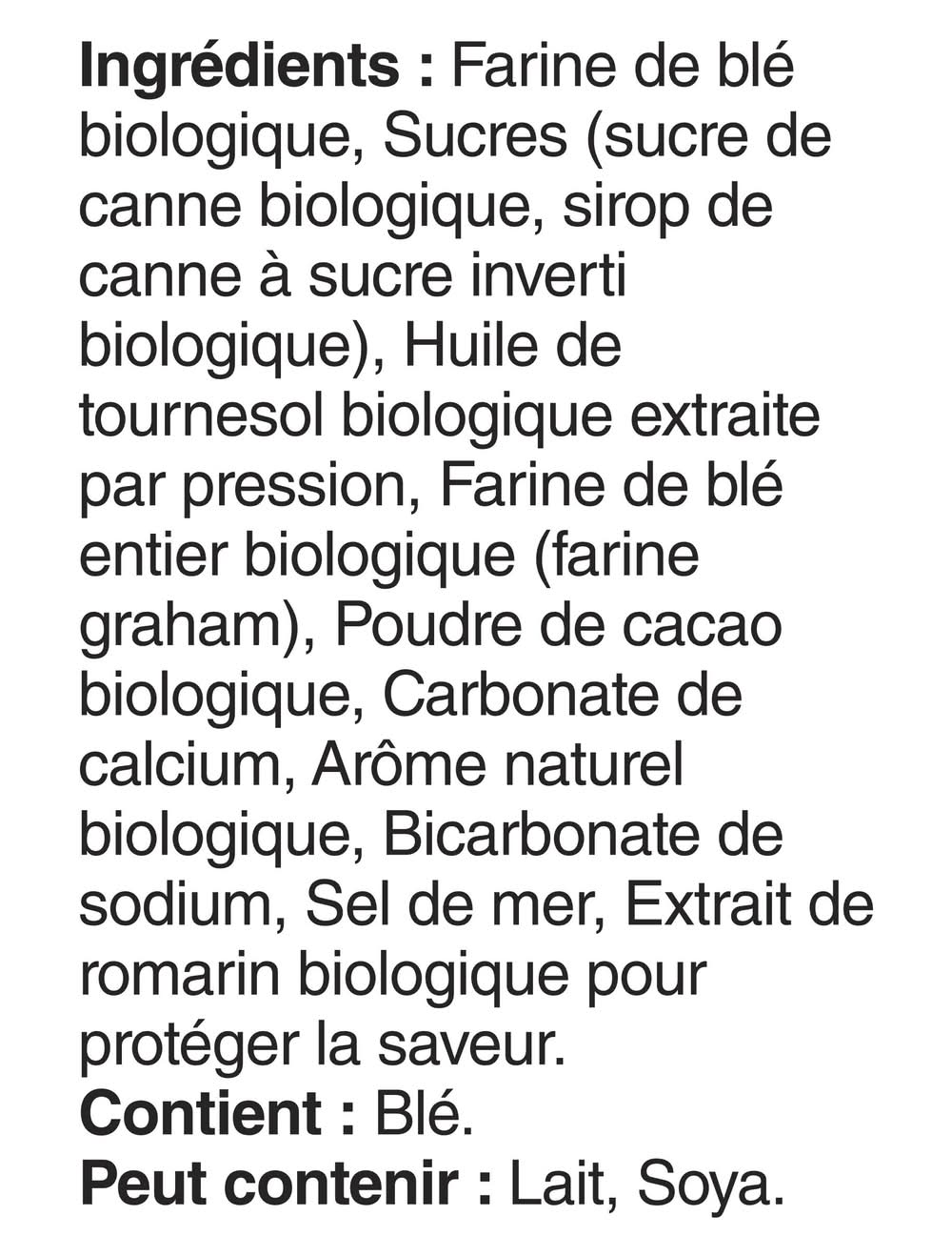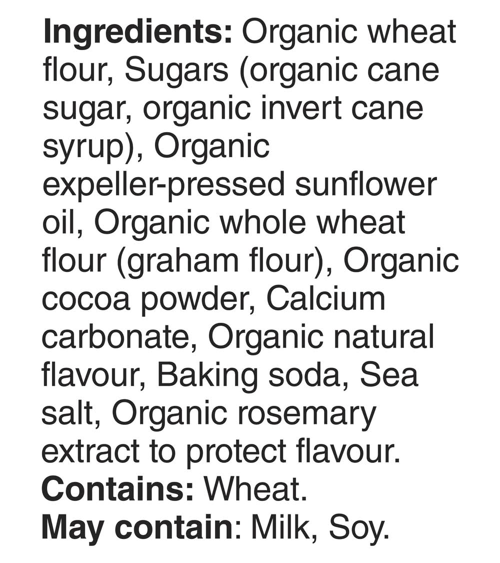 Ingredients: Organic Wheat Flour, Sugars (Organic Cane Sugar, Organic Invert Cane Syrup), Organic Expeller-Pressed Sunflower Oil, Organic Whole Wheat Flour (Graham Flour), Organic Cocoa Powder, Calcium Carbonate, Organic Natural Flavour, Baking Soda, Sea Salt, Organic Rosemary Extract To Protect Flavour Contains: Wheat and Their Derivatives, Milk and its derivates, Soybean and its Derivatives