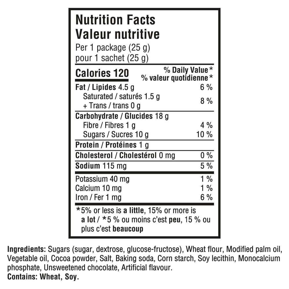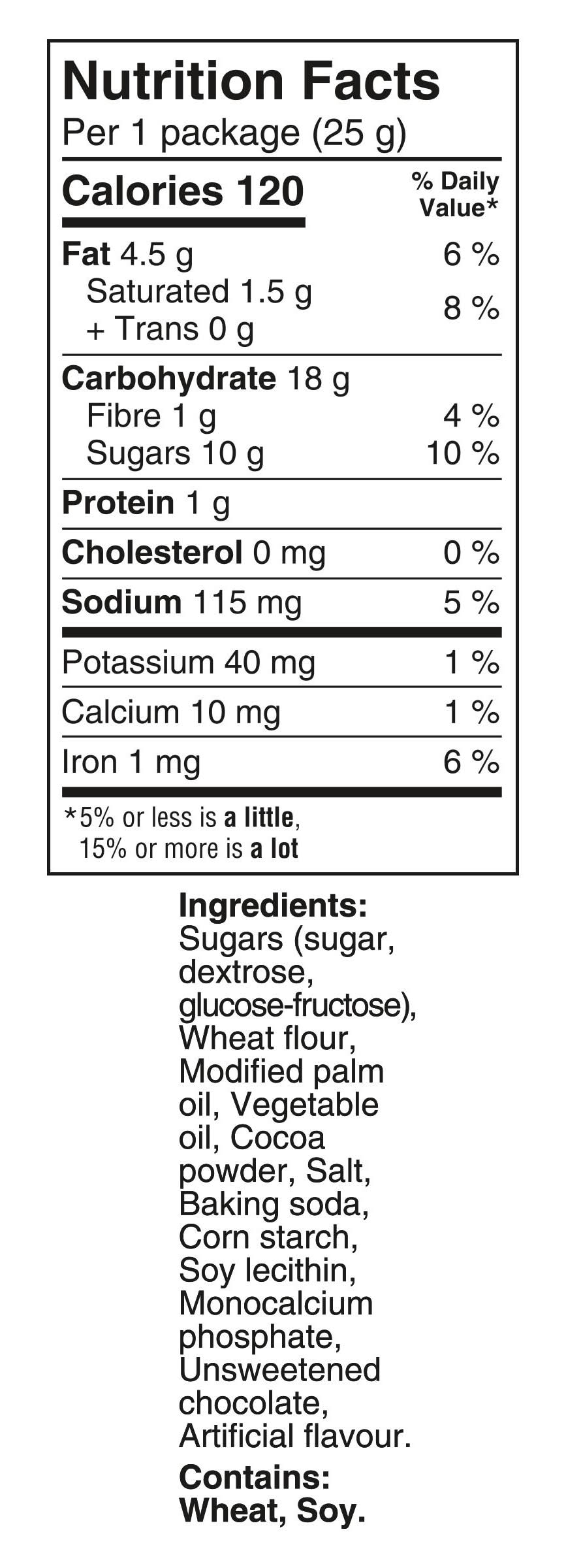 Ingredients: INGREDIENTS: Sugars (sugar, dextrose, glucose-fructose), Wheat flour, Modified palm oil, Vegetable oil, Cocoa powder, Salt, Baking soda, Corn starch, Soy lecithin, Monocalcium phosphate, Unsweetened chocolate, Artificial flavour.Contains: Wheat, Soy. Contains: Contains: Wheat, Soy.