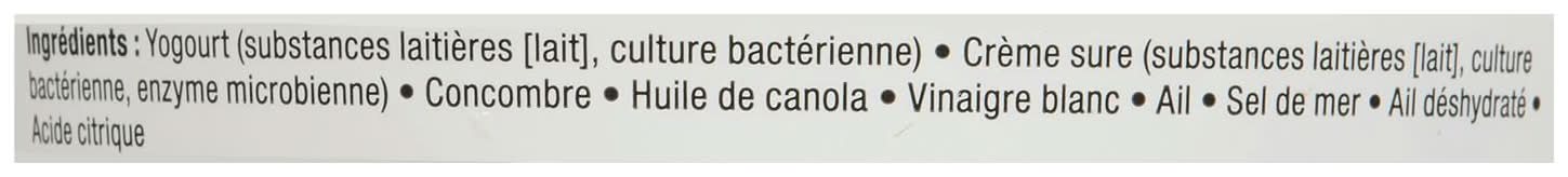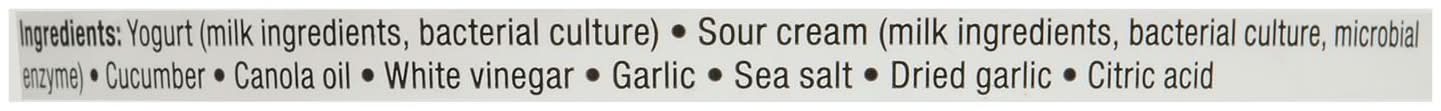 Ingredients: Yogurt, Sour Cream, Cucumber, Pressed Yogurt, Canola Oil, Garlic Pure, White Vinegar, Sea Salt, Dried Garlic