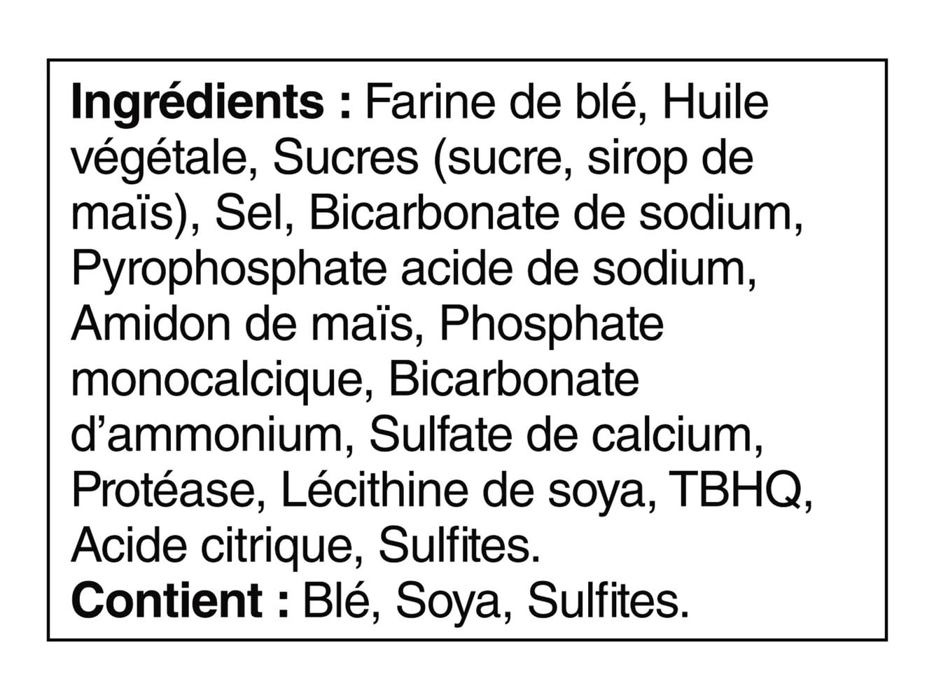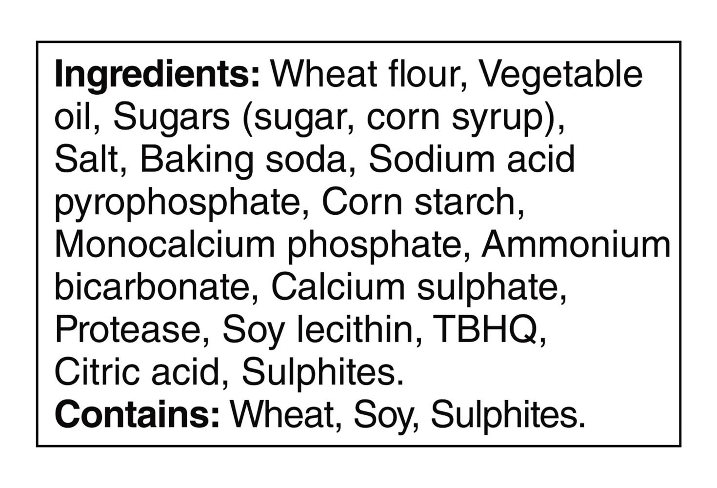 Ingredients: Wheat flour, Vegetable oil, Sugars (sugar, corn syrup), Salt, Baking soda, Sodium acid pyrophosphate, Corn starch, Monocalcium phosphate, Ammoniun bicarbonate, Calcium sulphate, Protease, Soy lecithin, TBHQ, Citric acid, Sulphites. Contains: Contains: wheat, soy, sulphites.