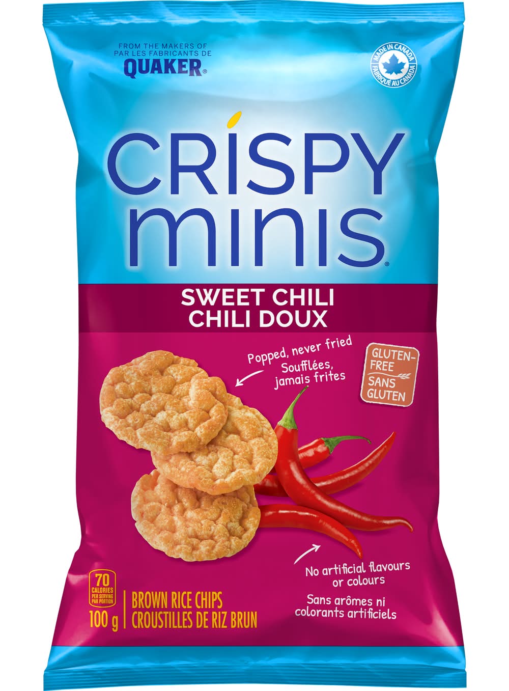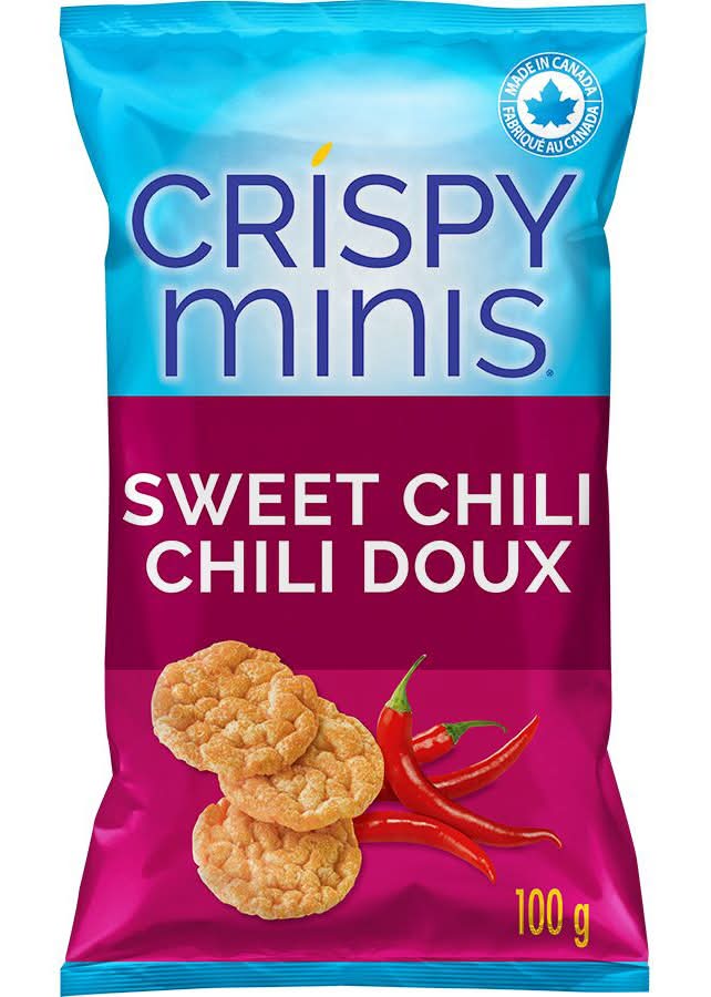 Take your taste buds on a trip to the orient with Crispy Minis® Sweet Chili flavour rice chips. It's a good feeling, knowing this flavourful blend of sweet, savoury and tangy also contains 9 grams of Whole Grain rice per 20 gram serving. And that makes it easy to enjoy these Asian-inspired rice chips again and again. Flavor: Sweet chili