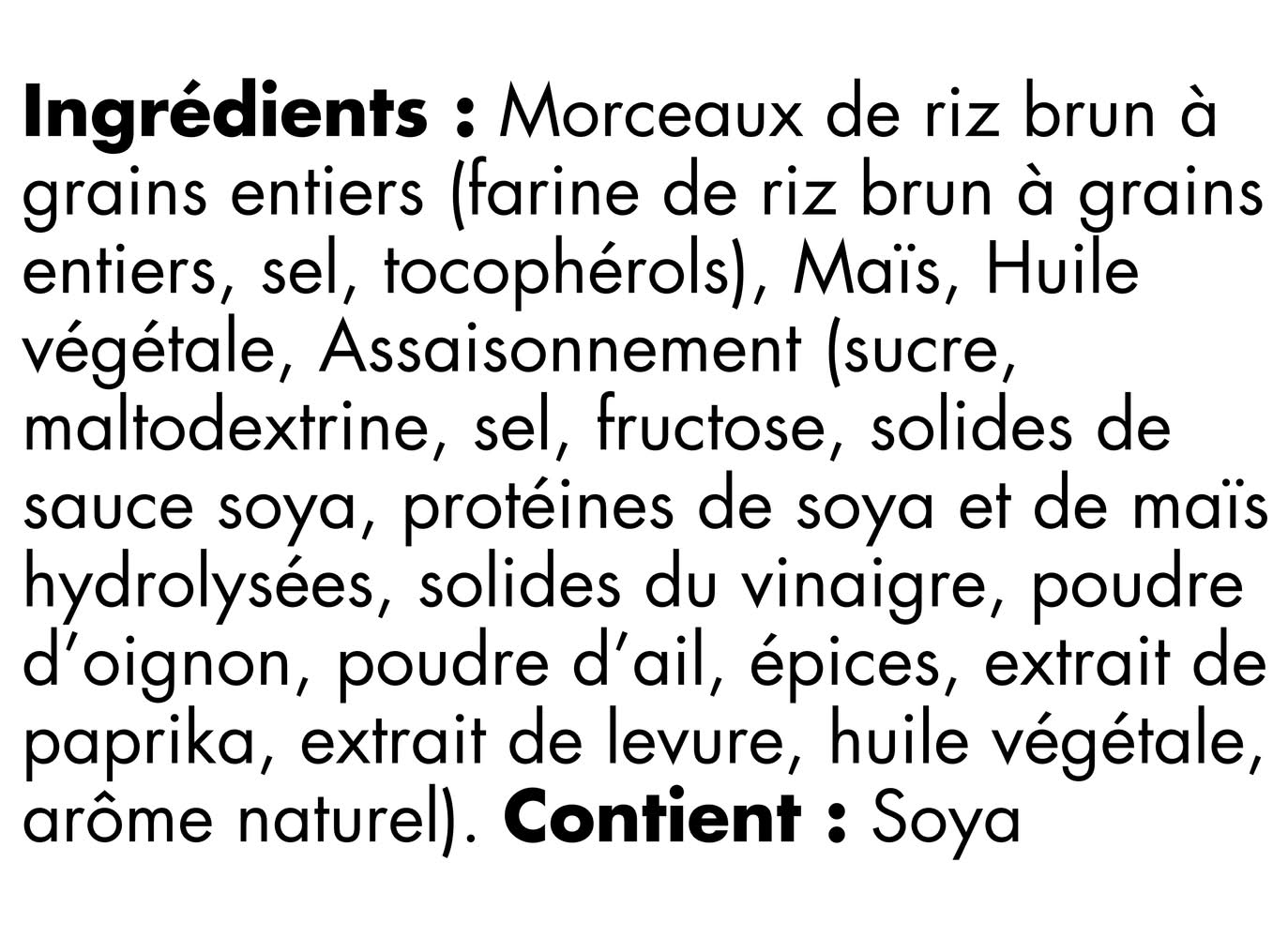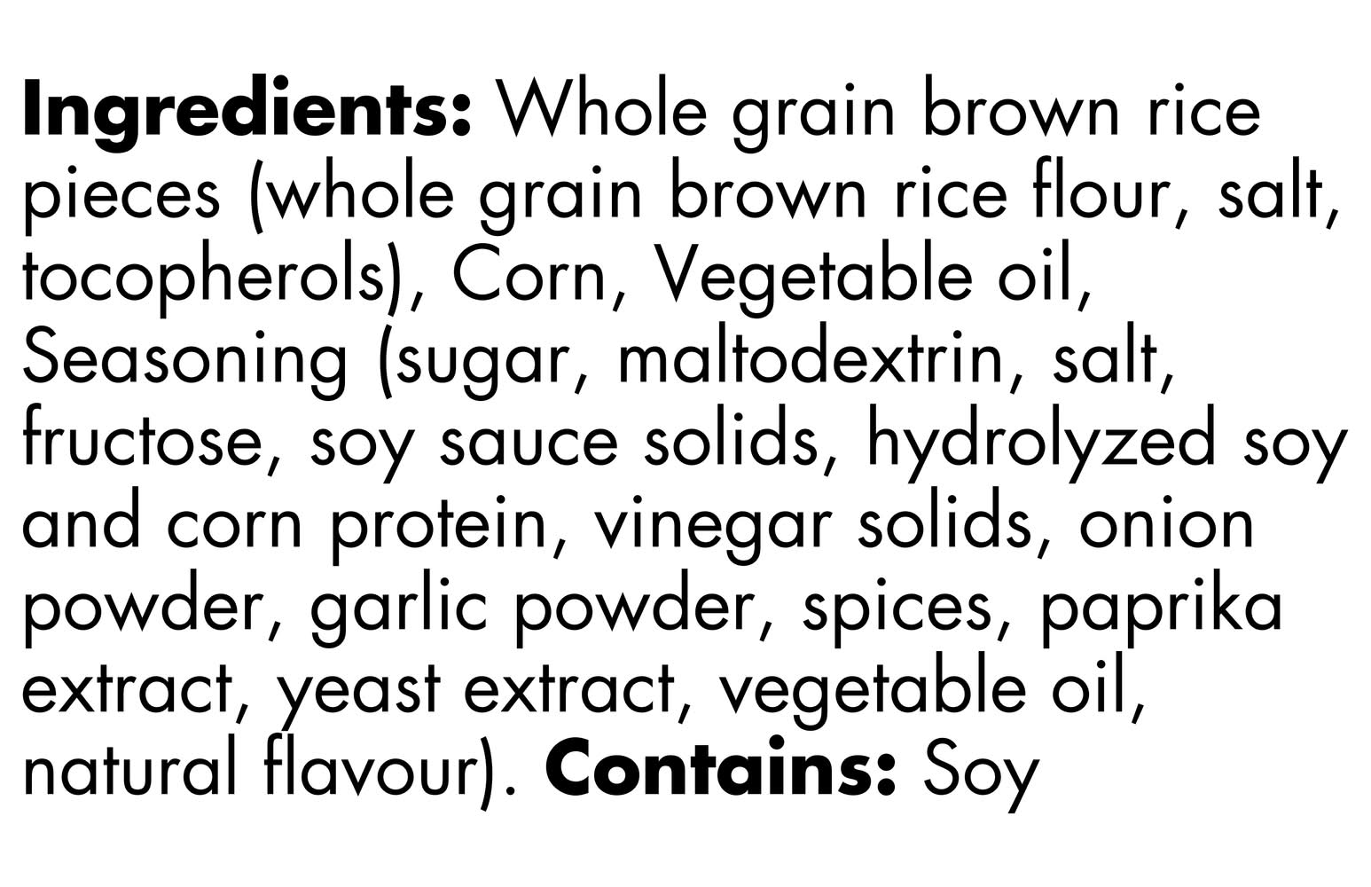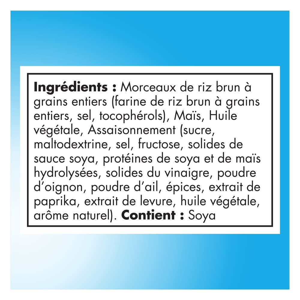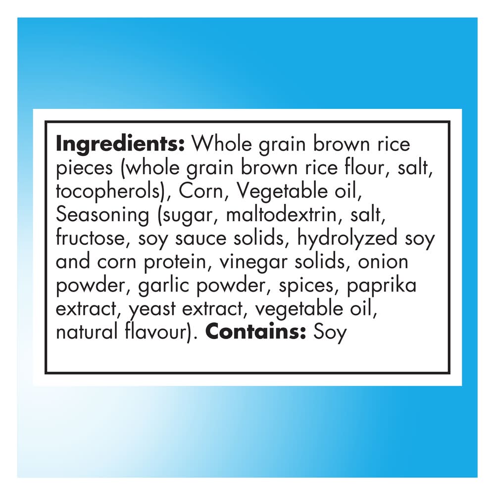 Ingredients: Whole grain brown rice pieces (whole grain brown rice flour, salt, tocopherols), Corn, Vegetable oil, Seasoning (sugar, maltodextrin, salt, fructose, soy sauce solids, hydrolyzed soy and corn protein, vinegar solids, onion powder, garlic powder, spices, paprika extract, yeast extract, vegetable oil, natural flavour), . Contains: Soy Contains: Contains Soy Ingredients.