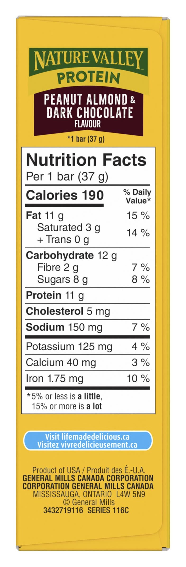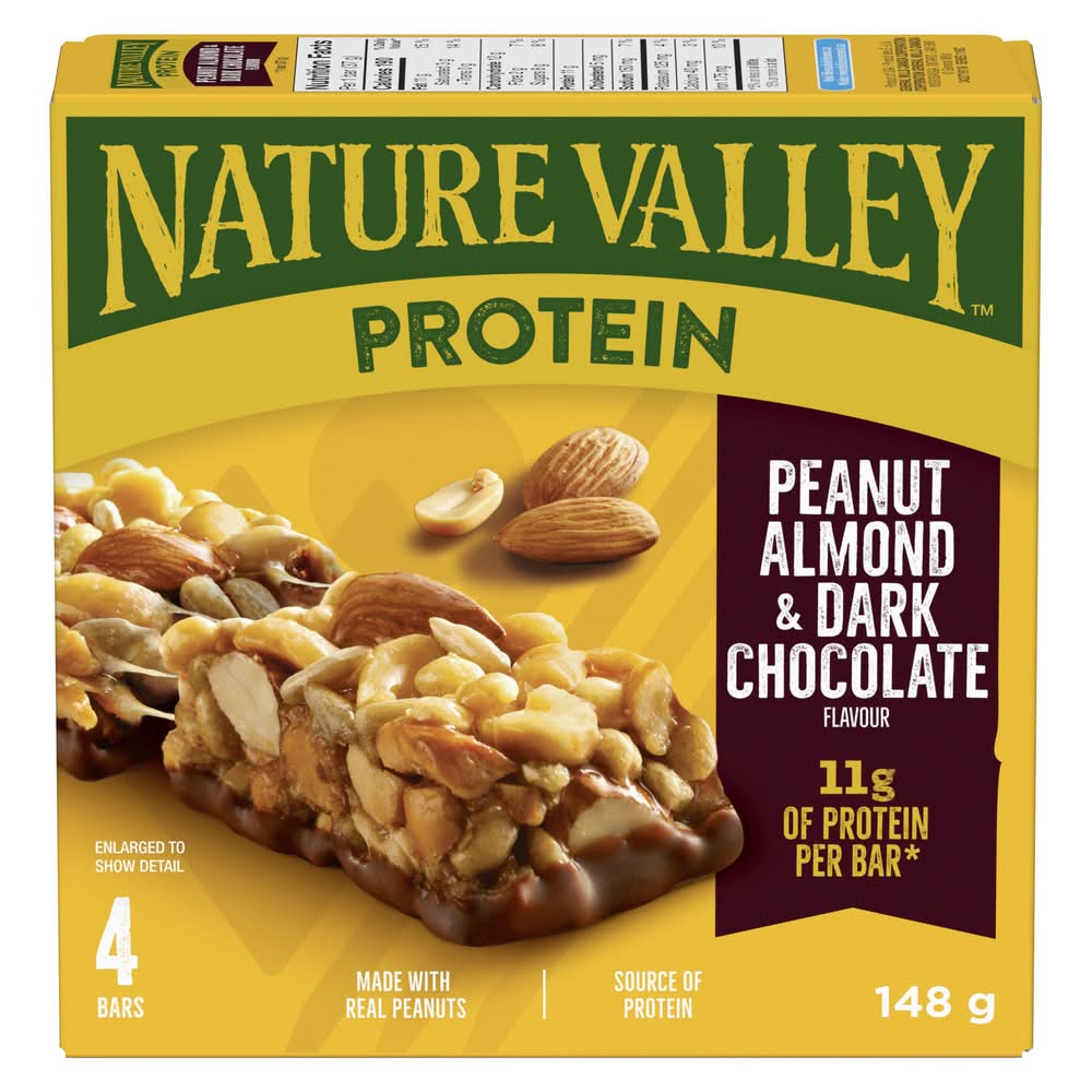 Nature Valley Protein Peanut Almond & Dark Chocolate Bars offer a blend of roasted peanuts and almonds with a rich dark chocolate flavored coating. These bars serve as a convenient snack option for those with active lifestyles. Each pack contains 4 protein bars. Flavor: Assorted