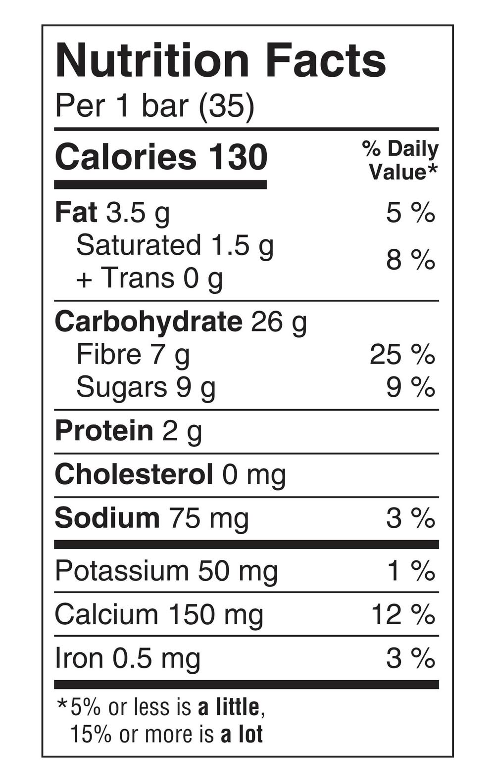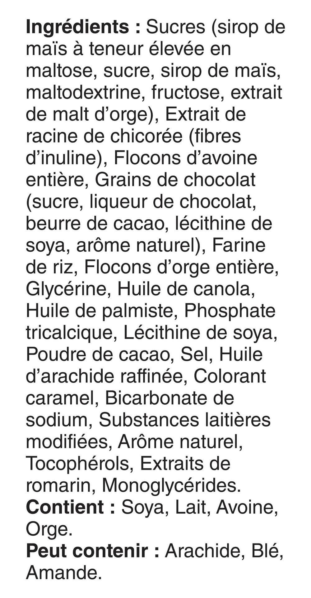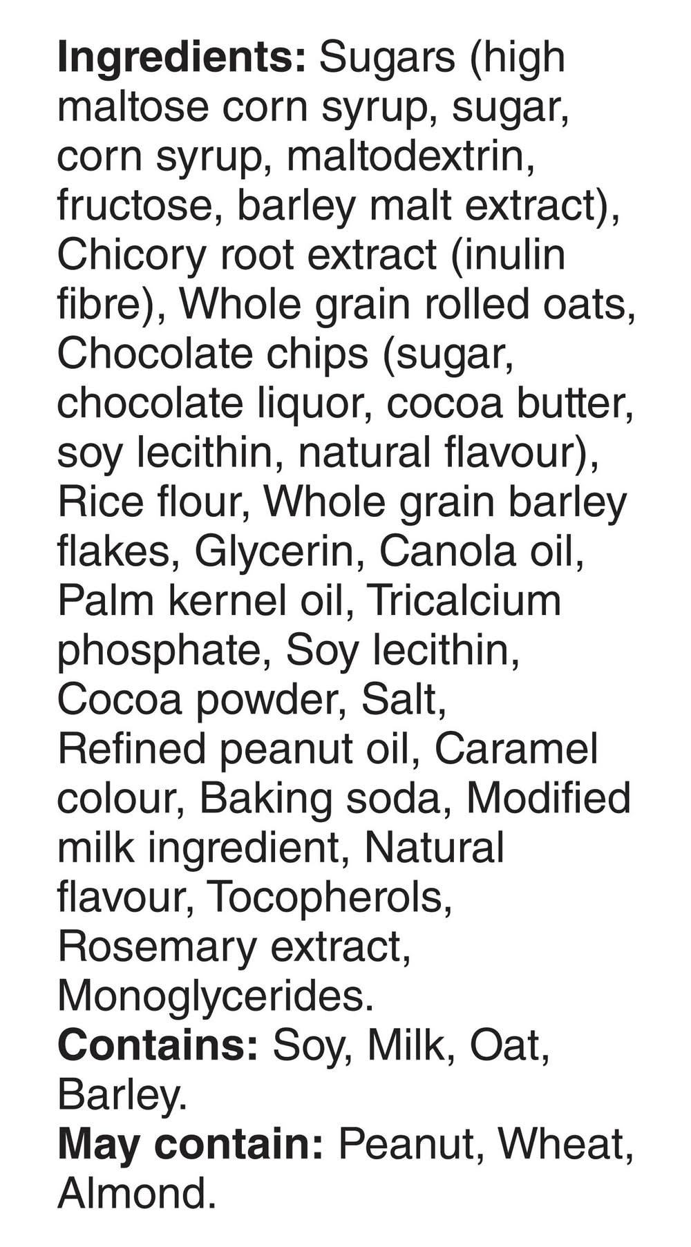 Ingredients: Sugars (High Maltose Corn Syrup, Sugar, Corn Syrup, Maltodextrin, Fructose, Barley Malt Extract), Chicory Root Extract (Inulin Fibre), Whole Grain Rolled Oats, Chocolate Chips (Sugar, Chocolate Liquor, Cocoa Butter, Soy Lecithin, Natural Flavour), Rice Flour, Whole Grain Barley Flakes, Glycerin, Canola Oil, Palm Kernel Oil, Tricalcium Phosphate, Soy Lecithin, Cocoa Powder, Salt, Refined Peanut Oil, Caramel Colour, Baking Soda, Modified Milk Ingredient, Natural Flavour, Tocopherols, Rosemary Extract, Monoglycerides Contains: Wheat and Their Derivatives, Almond And Almond Products, Milk and its derivates, Peanuts and their derivates, Soybean and its Derivatives, Barley and Barley Products, Sunflower Seeds and Their Derivatives, Oats