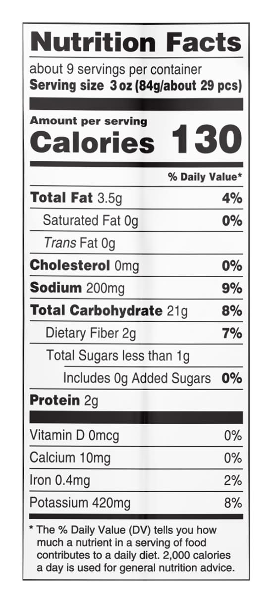 Ingredients: Potatoes, Vegetable Oil (Contains One or More of the Following: High Oleic Canola, Canola, Sunflower), Sea Salt, Apple Juice Concentrate (to Promote Browning)