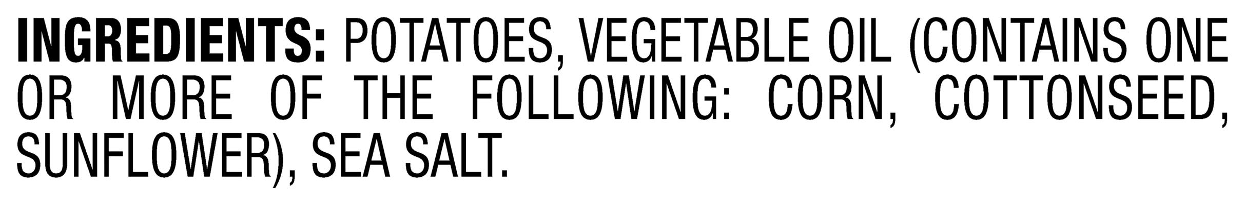 Ingredients: Potatoes, Vegetable Oil (Contains One or More of the Following: Corn, Cottonseed, Sunflower), Sea Salt Contains: 'Free From Gluten'