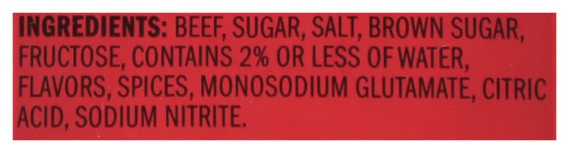 Ingredients: Beef, Sugar, Salt, Brown Sugar, Fructose, Contains 2% or Less of Water, Flavors, Spices, Monosodium Glutamate, Citric Acid, Sodium Nitrite