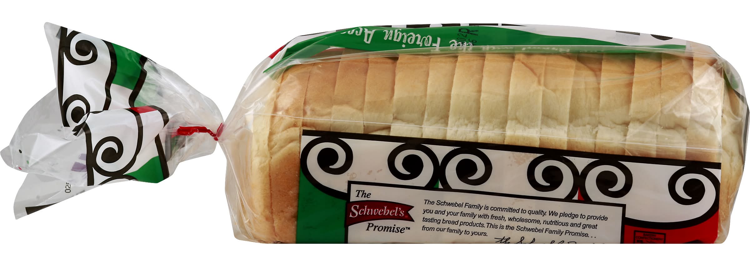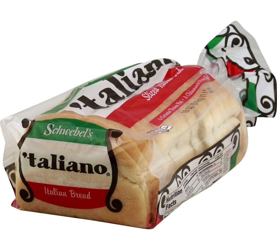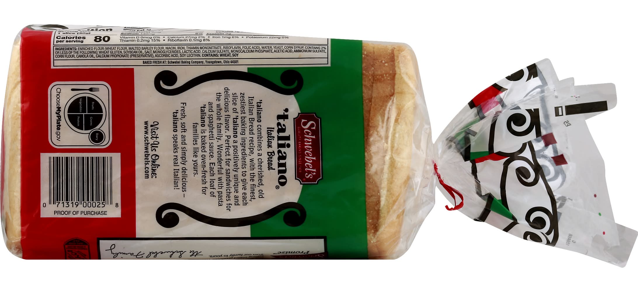 0 grams trans fat. Per 1 Slice: 80 calories; 0 g sat fat (0% DV); 140 mg sodium (6% DV); 1 g sugars. A cholesterol free food. The bread with the foreign accent. Quality baking since 1908. 'taliano combines a cherished, old Italian bread recipe, with the finest, zestiest baking ingredients to give each slice of 'taliano a positively unique and delicious flavor. Perfect for sandwiches for the whole family. Wonderful with pasta and spaghetti sauce. Each loaf of 'taliano is baked oven-fresh for families like yours. Fresh, soft and simply delicious-taliano speaks real Italian! Dairy. Fruits. Grains. Vegetables. Protein. The Schwebel’s Promise: The Schwebel Family is committed to quality. We pledge to provide you and your family with fresh, wholesome, nutritious and great tasting bread products. This is the Schwebel Family Promise - from our family to yours. - The Schwebel Family. www.schwebels.com. ChooseMyPlate.gov. Visit us online: www.schwebels.com. BCTGM: Bakery Confectionery Tobacco Workers & Grain Millers. Union made. AFL-CIO CLC.