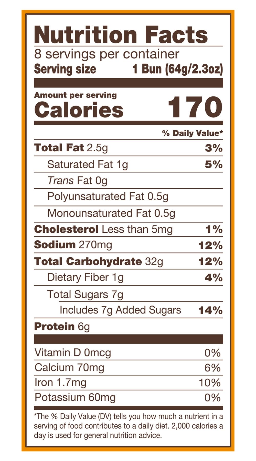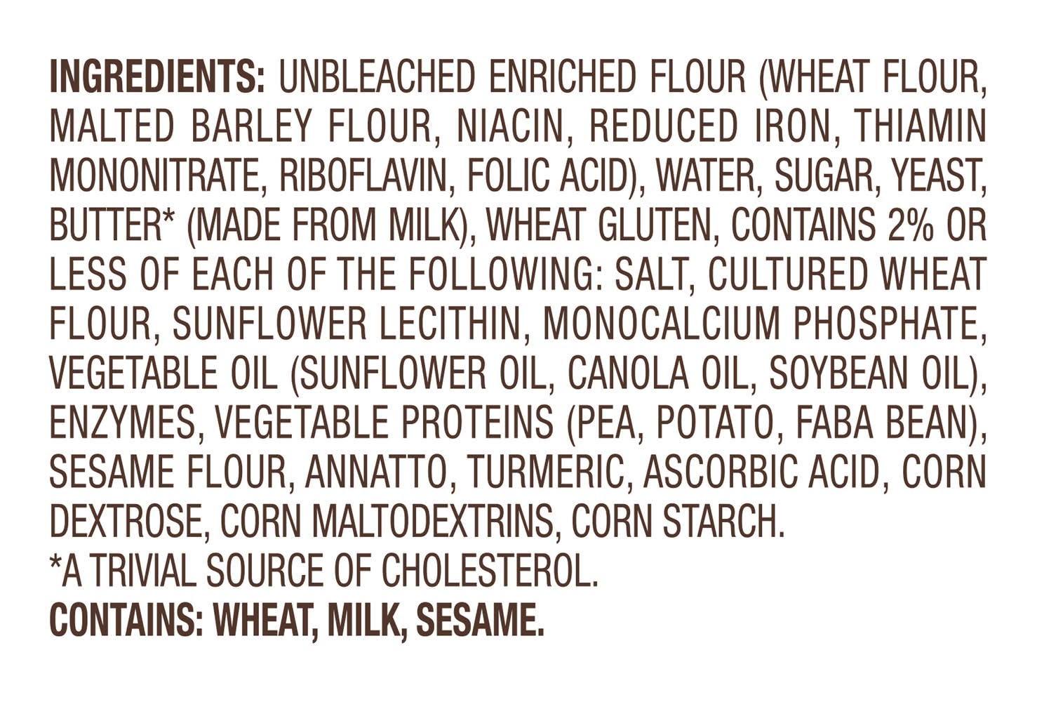 Ingredients: Unbleached Enriched Flour (Wheat Flour, Malted Barley Flour, Niacin, Reduced Iron, Thiamin Mononitrate, Riboflavin, Folic Acid), Water, Sugar, Yeast, Butter* (Made from Milk), Wheat Gluten, Contains 2% or Less of Each of the Following: Salt, Cultured Wheat Flour, Sunflower Lecithin, Monocalcium Phosphate, Vegetable Oil (Sunflower Oil, Canola Oil, Soybean Oil), Enzymes, Vegetable Proteins (Pea, Potato, Faba Bean), Sesame Flour, Annatto, Turmeric, Ascorbic Acid, Corn Dextrose, Corn Maltodextrins, Corn Starch. * a Trivial Source of Cholesterol Contains: Wheat, Milk, Sesame, Barley, Gluten, Soybeans