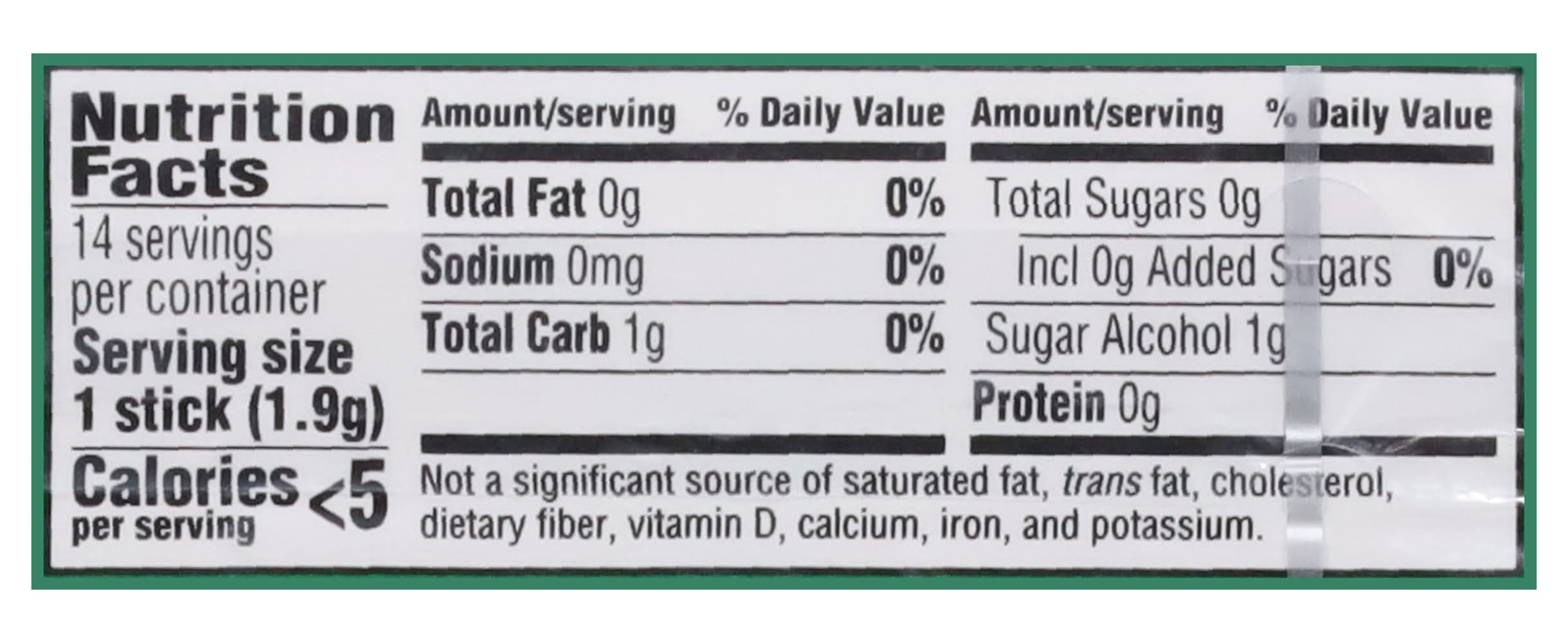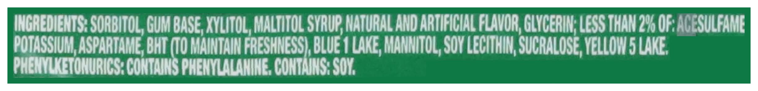 Ingredients: Sorbitol, Gum Base, Xylitol, Maltitol Syrup, Natural and Artificial Flavor, Glycerin; Less than 2% of: Acesulfame Potassium, Aspartame, BHT (to Maintain Freshness), Blue 1 Lake, Mannitol, Soy Lecithin, Sucralose, Yellow 5 Lake Contains: Soybeans