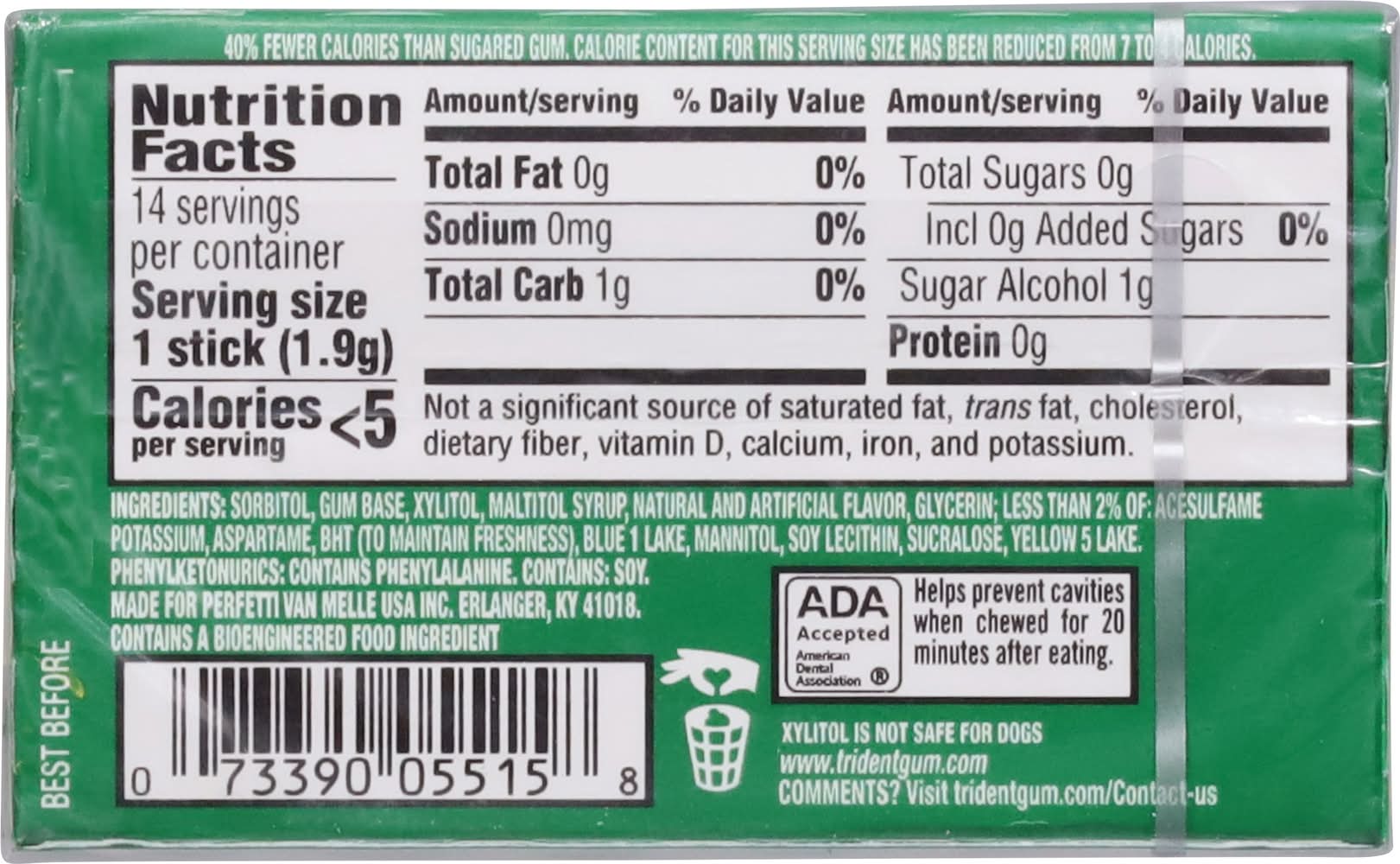 Artificial flavor. Sugar free gum. 40% fewer calories than sugared gum, calorie content for this serving size has been reduced from 7 to 4 calories. Contains a bioengineered food ingredient. Refreshingly long lasting. ADA: Accepted. American Dental Association. Helps prevent cavities when chewed for 20 minutes after eating. www.tridentgum.com. Comments? Visit tridentgum.com/contact-us. Flavor: Spearmint