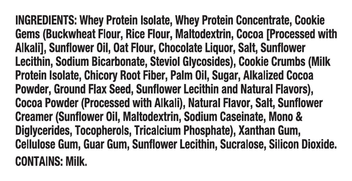 Ingredients: Whey Protein Isolate, Whey Protein Concentrate, Cookie Gems (Buckwheat Flour, Rice Flour, Maltodextrin, Cocoa [Processed with Alkali], Sunflower Oil, Oat Flour, Chocolate Liquor, Salt, Sunflower Lecithin, Sodium Bicarbonate, Steviol Glycosides), Cookie Crumbs (Milk Protein Isolate, Chicory Root Fiber, Palm Oil, Sugar, Alkalized Cocoa Powder, Ground Flax Seed, Sunflower Lecithin and Natural Flavors), Cocoa Powder (Processed with Alkali), Natural Flavor, Salt, Sunflower Creamer (Sunflower Oil, Maltodextrin, Sodium Caseinate, Mono & Diglycerides, Tocopherols, Tricalcium Phosphate), Xanthan Gum, Cellulose Gum, Guar Gum, Sunflower Lecithin, Sucralose, Silicon Dioxide Contains: Milk, Oat