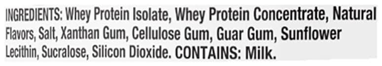 Ingredients: Whey Protein Isolate, Whey Protein Concentrate, Natural Flavors, Salt, Xanthan Gum, Cellulose Gum, Guar Gum, Sunflower Lecithin, Sucralose, Silicon Dioxide Contains: Milk
