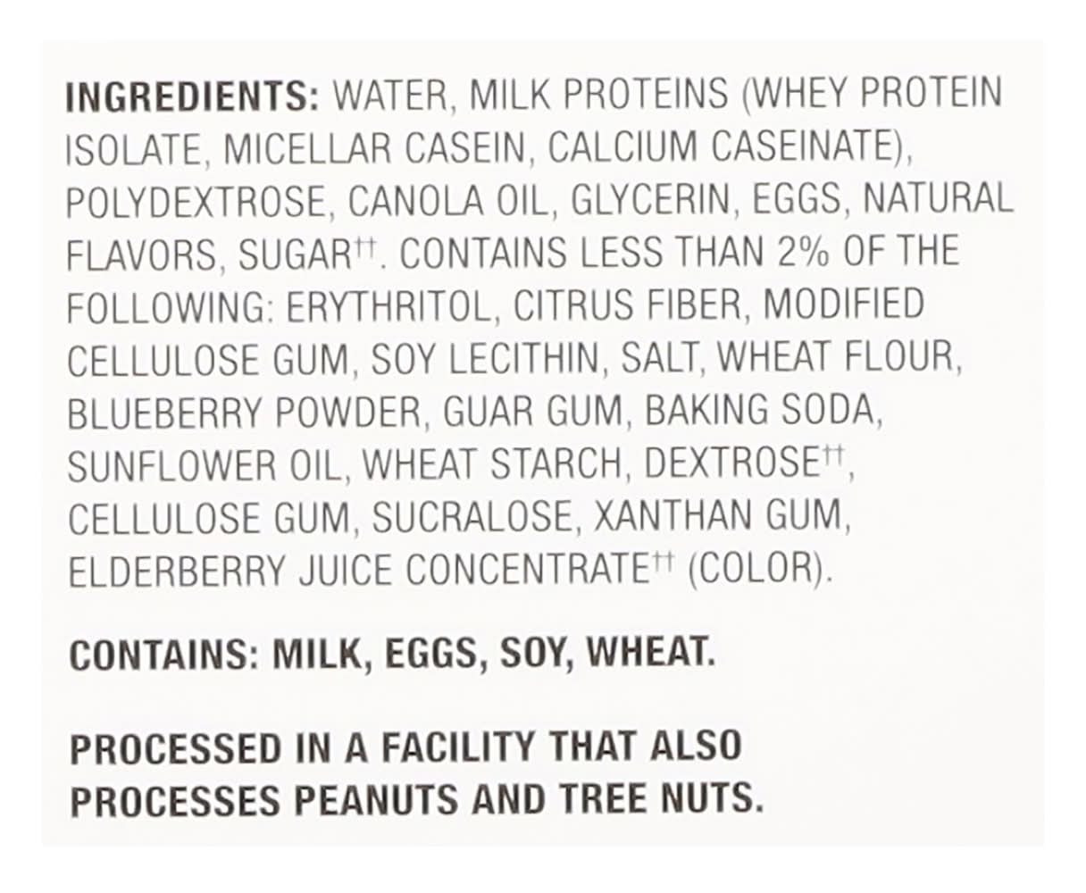 Ingredients: Water, Milk Proteins (Whey Protein Isolate, Micellar Casein, Calcium Caseinate), Polydextrose, Canola Oil, Glycerin, Eggs, Natural Flavors, Sugar Contains Less than 2% of the Following: Erythritol, Citrus Fiber, Modified Cellulose Gum, Soy Lecithin, Salt, Wheat Flour, Blueberry Powder, Guar Gum, Baking Soda, Sunflower Oil, Wheat Starch, Dextrose (Adds a Trivial Amount of Added Sugars), Cellulose Gum, Sucralose, Xanthan Gum, Elderberry Juice Concentrate (Adds a Trivial Amount of Added Sugars) (Color) Contains: Milk, Eggs, Soybeans, Wheat, Peanuts, Tree Nuts