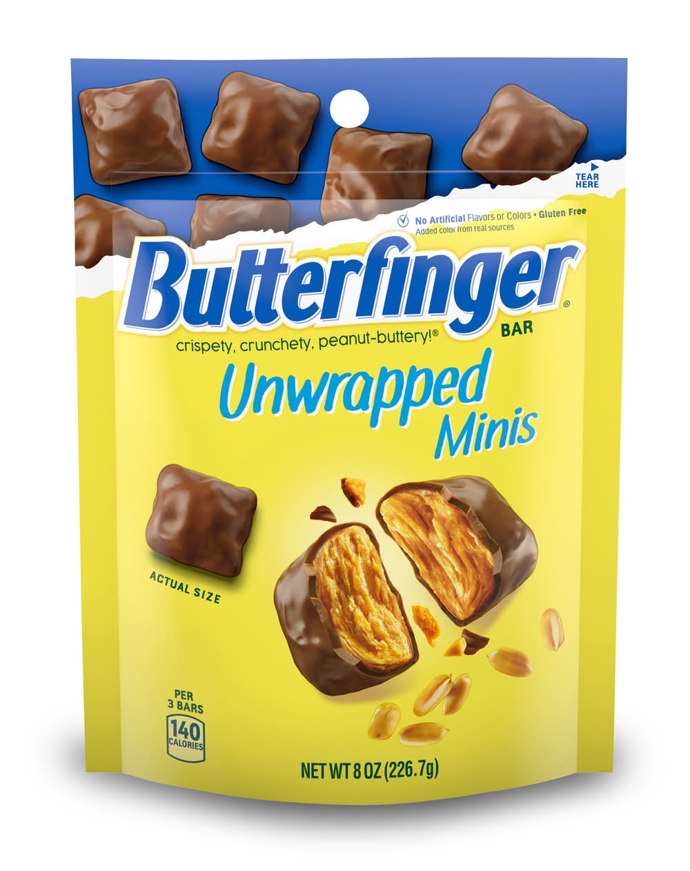 It's time to get your treat on with Butterfinger Unwrapped Minis. These bite-sized, peanut-buttery, chocolatey bites are mini in size but big on taste. Packed with the crispety, crunchety, peanut-buttery taste everyone knows and loves, these unwrapped mini peanut-buttery, chocolatey bars are easy to share, snack on and enjoy. The resealable bag lets you take these peanut-buttery, chocolatey bites anywhere and share with anyone. They're great for watching movies on the couch or taking them on the go. Butterfinger is made with no artificial flavors or colors and is gluten-free. Butterfinger Unwrapped Minis are the irresistible treat you love to share. • Ferrero USA, Inc., Parsippany,NJ,07054 • Packaging: Reusable