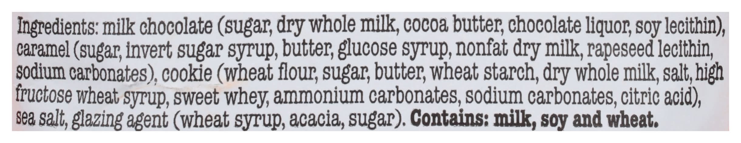 Ingredients: Milk Chocolate (Sugar, Dry Whole Milk, Cocoa Butter, Chocolate Liquor, Soy Lecithin), Caramel (Sugar, Invert Sugar Syrup, Butter, Glucose Syrup, Nonfat Dry Milk, Rapeseed Lecithin, Sodium Carbonates), Cookie (Wheat Flour, Sugar, Butter, Wheat Starch, Dry Whole Milk, Salt, High Fructose Wheat Syrup, Sweet Whey, Ammonium Carbonates, Sodium Carbonates, Citric Acid), Sea Salt, Glazing Agent (Wheat Syrup, Acacia, Sugar) Contains: Milk, Soybeans, Wheat