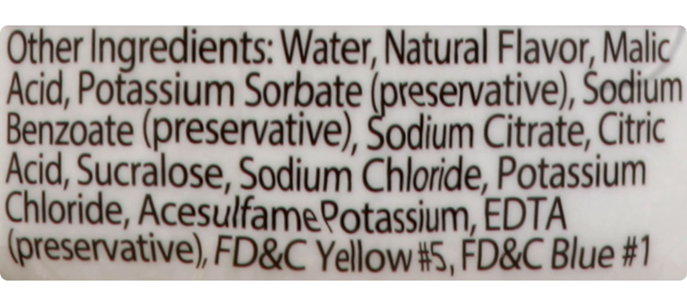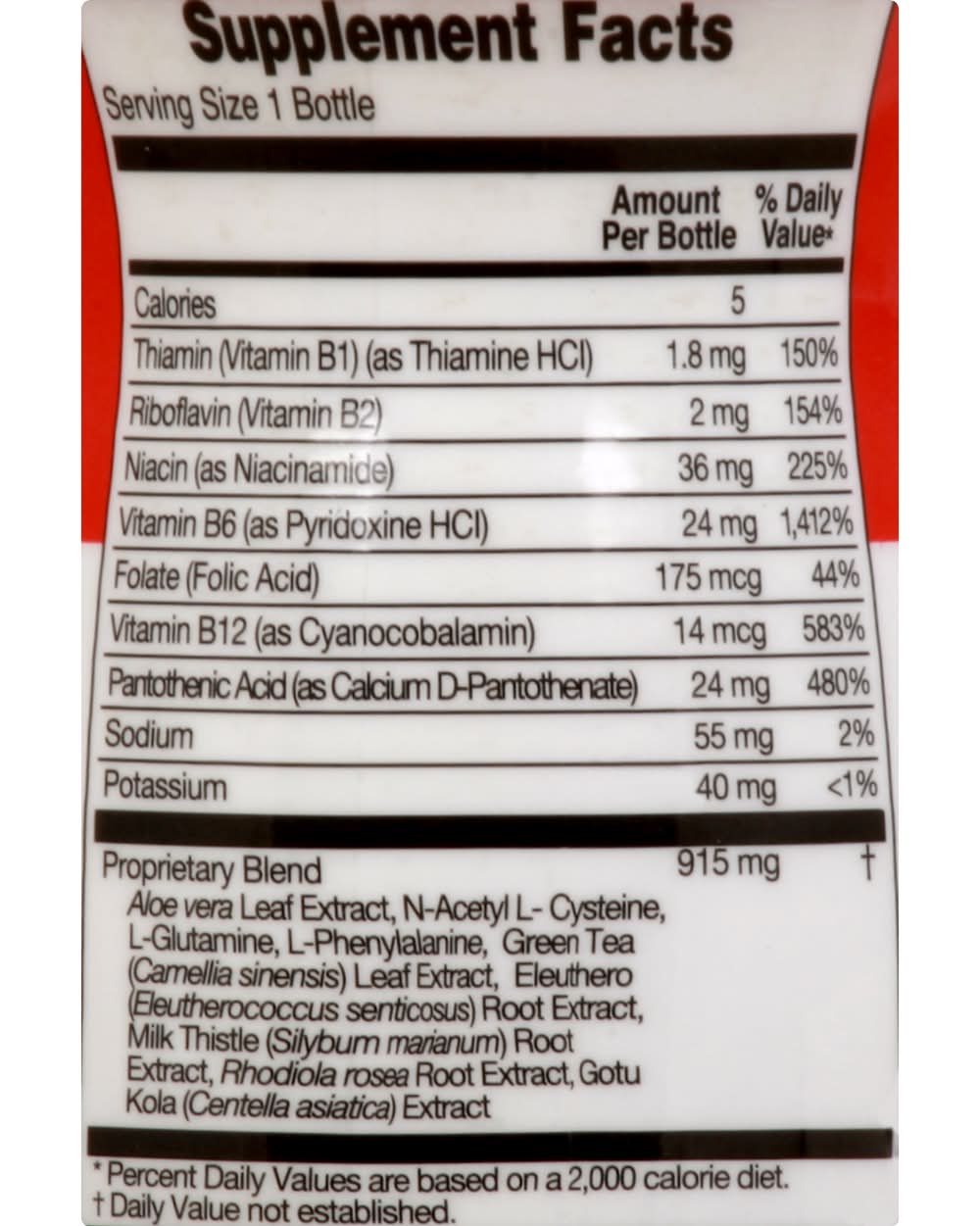 Ingredients: Proprietary Blend: Aloe Tea Leaf Extract, N-Acetyl L- Cysteine, L-Glutamine, L-Phenylalanine, Green Tea (Camellia Sinensis) Leaf Extract, Eleuthero (Eleutherococcus Senticosus) Root Extract, Milk Thistle (Silybum Marianum) Root Extract, Rhodiola Rosea Raw Root Extract, Gotu Kola (Centella Asiatica) Extract. Other Ingredients: Water, Natural Flavor, Malic Acid, Potassium Sorbate (Preservative), Sodium Benzoate (Preservative), Sodium Citrate, Citric Acid, Sucralose, Sodium Chloride, Potassium Chloride, Acesulfame Potassium, EDTA (Preservative), FD&C Yellow 5, FD&C Blue 1