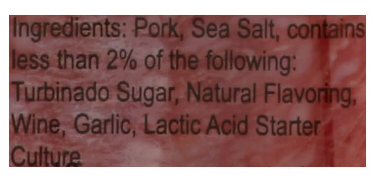 Ingredients: Pork, Sea Salt, Contains Less than 2% of the Following: Turbinado Sugar, Natural Flavoring, Wine, Garlic, Lactic Acid Starter Culture