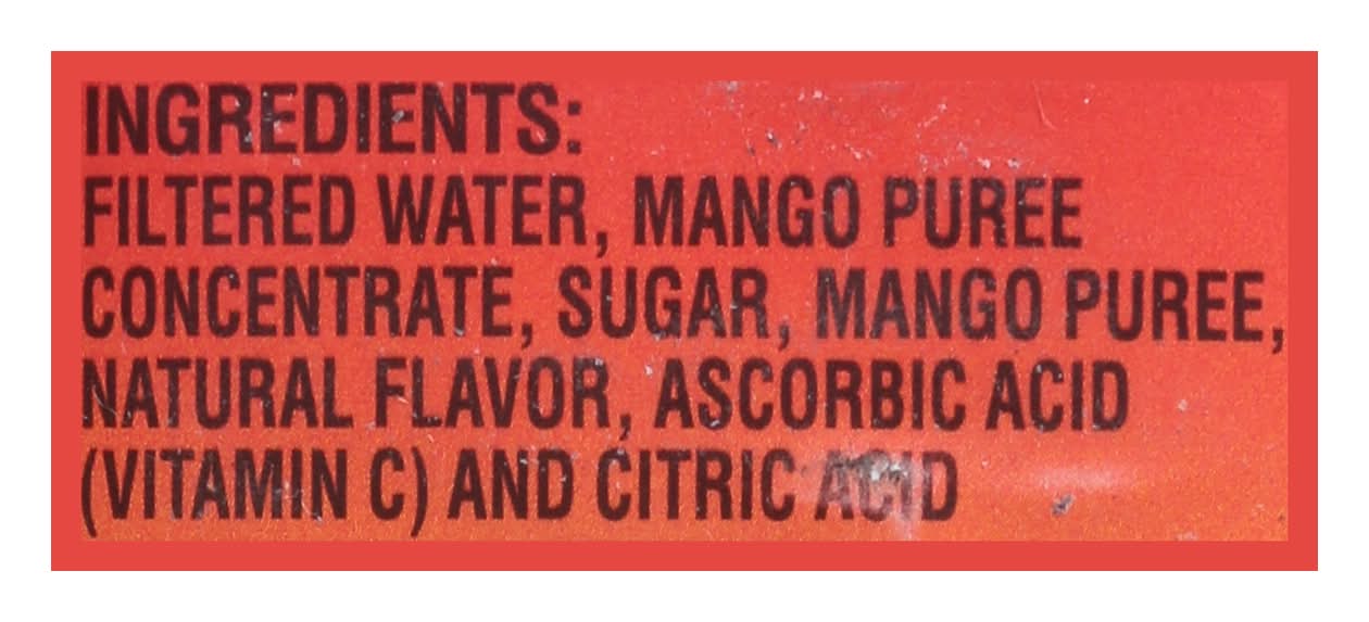 Ingredients: Filtered Water, Mango Puree Concentrate, Sugar, Mango Puree, Natural Flavor, Ascorbic Acid (Vitamin C) and Citric Acid Contains: 'Gluten Free From'