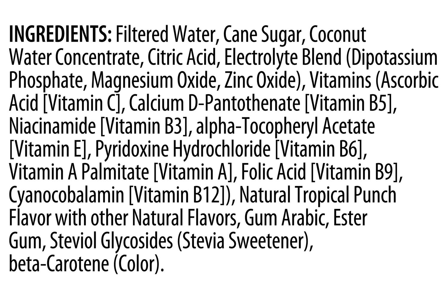 Ingredients: Filtered Water, Pure Cane Sugar, Coconut Water Concentrate, Citric Acid, Dipotassium Phosphate (Electrolyte), Ascorbic Acid (Vitamin C), Magnesium Oxide (Electrolyte), Natural Tropical Punch Flavor With Other Natural Flavors, Gum Arabic, Niacinamide (Vitamin B3), Calcium D-Pantothenate (Vitamin B5), Alpha-Tocopheryl Acetate (Vitamin E), Ester Gum, Zinc Oxide (Electrolyte), Pyridoxine Hydrochloride (Vitamin B6), Folic Acid (Vitamin B9), Vitamin A Palmitate (Vitamin A), Beta-Carotene (Color), Cyanocobalamin (Vitamin B12).