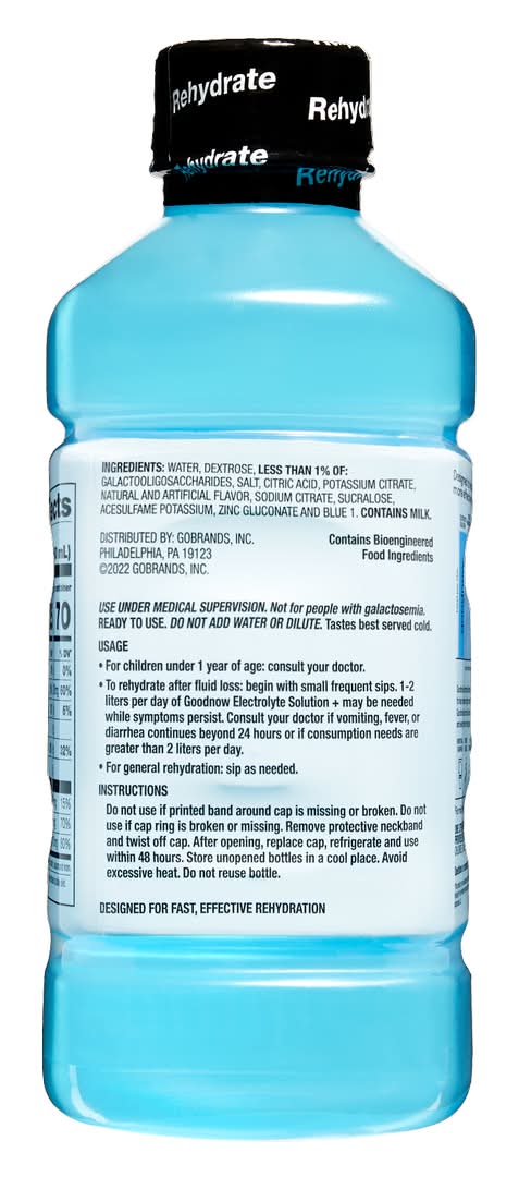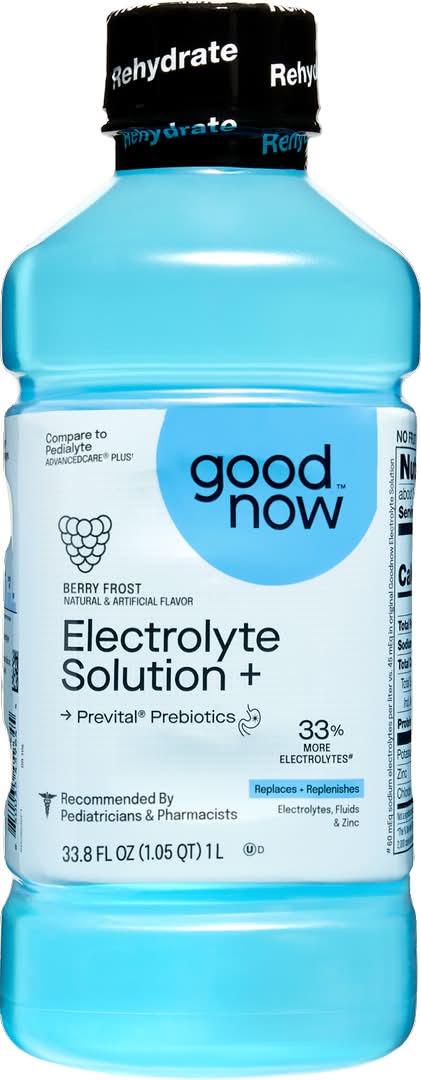 Goodnow Electrolyte Solution Berry Frost is packaged in a 1L plastic bottle and is designed to replenish electrolytes, fluids, and Zinc. It contains Prevital® Prebiotics and is manufactured in a third-party GMP certified facility.