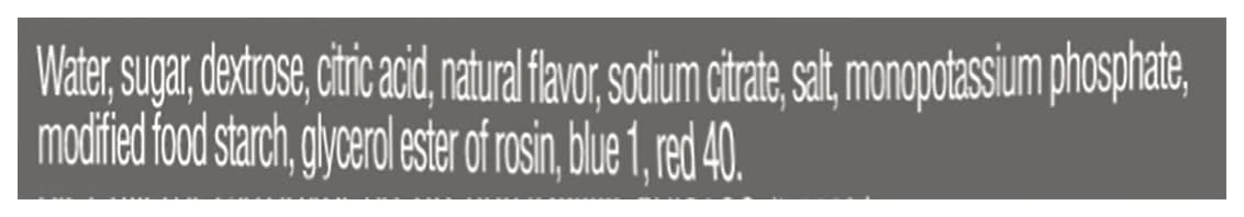 Ingredients: Water, Sugar, Dextrose, Citric Acid, Natural Flavor, Sodium Citrate, Salt, Monopotassium Phosphate, Modified Food Starch, Glycerol Ester of Rosin, Blue 1, Red 40