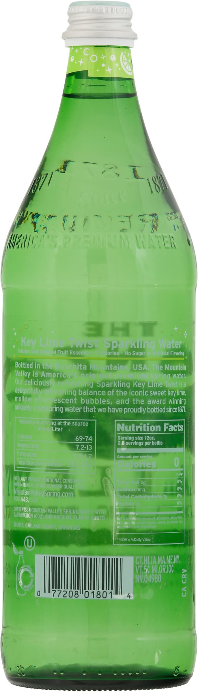 The mountain valley in America’s original premium spring water. Delightfully refreshing balance of the iconic sweet key lime, mellow effervescent bubbles, and the award winning uniquely crisp spring water that we have proudly bottles since 1871.Content: Mountain valley spring water with carbonation (co2) and natural flavor added. Source: Garland county, Arkansas. • Flavor: Key lime twist • Number of servings: 2 • Packaging: Reusable