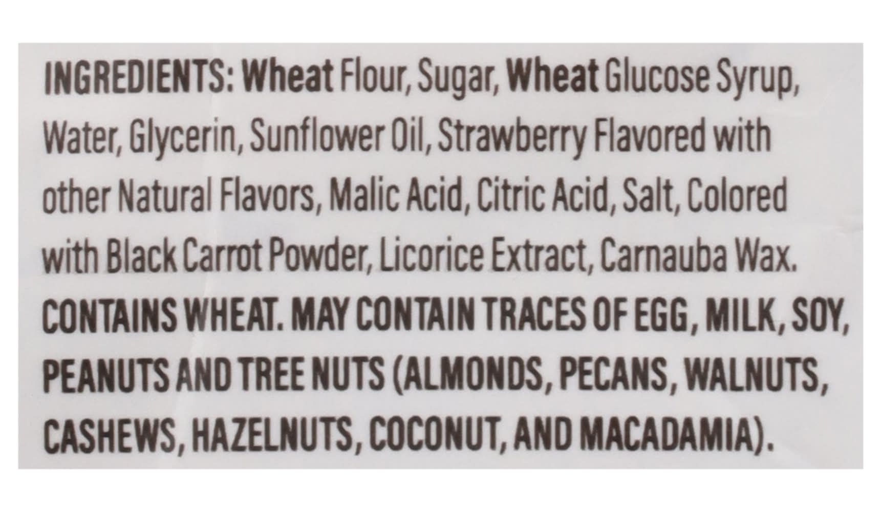 Ingredients: Wheat Flour, Sugar, Wheat Glucose Syrup, Water, Glycerin, Sunflower Oil, Strawberry Flavored with Other Natural Flavors, Malic Acid, Citric Acid, Salt, Colored with Black Carrot Powder, Licorice Extract, Carnauba Wax Contains: Wheat, Eggs, Milk, Soybeans, Peanuts, Tree Nuts