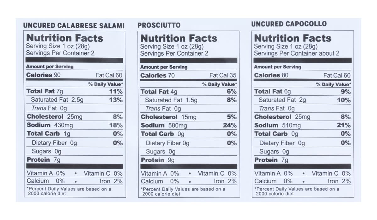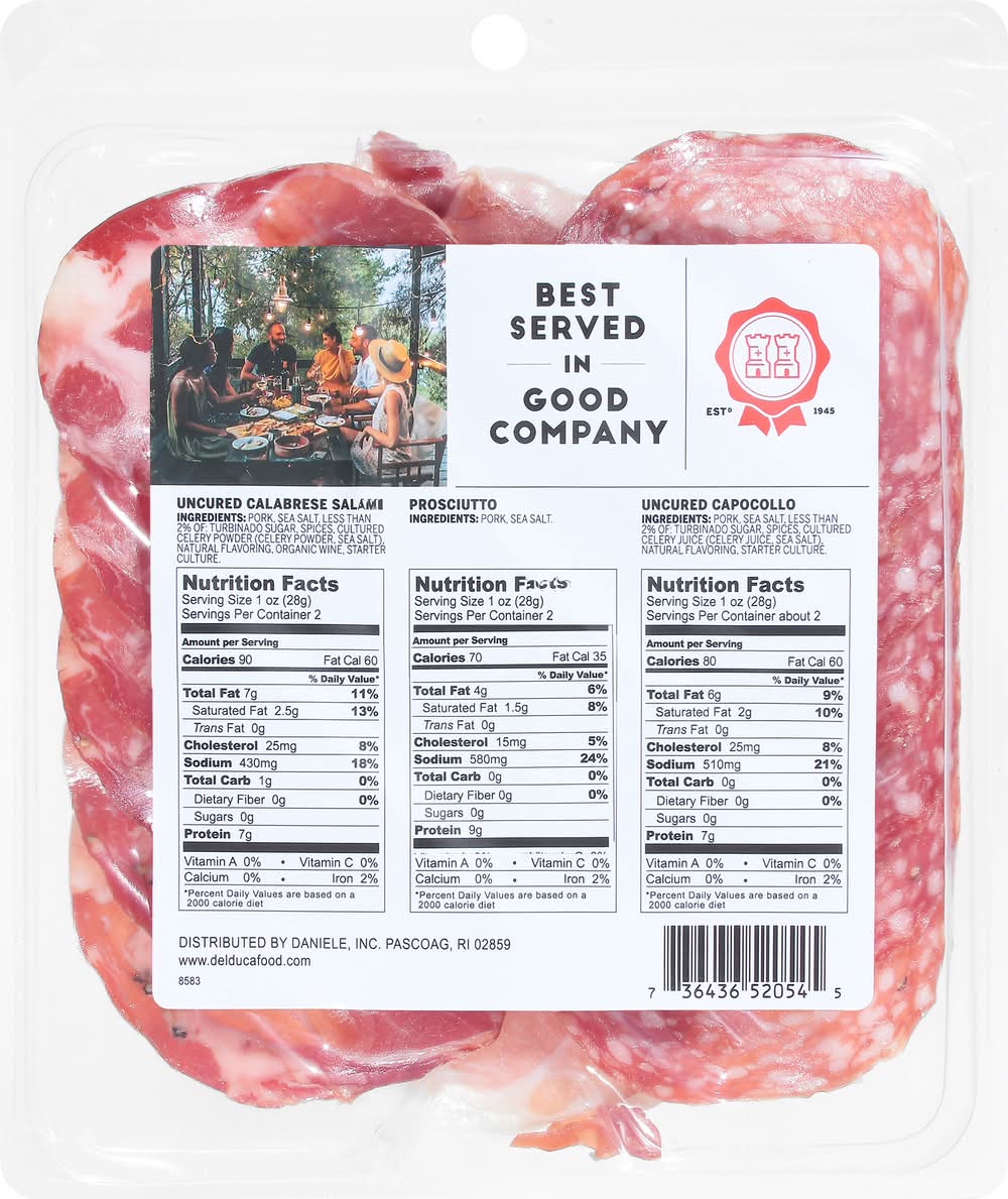 Ingredients: Uncured Calabrese Salami: Uncured Calabrese Salami Ingredients: Pork, Sea Salt, Less than 2% of Turbinado Sugar, Spices, Cultured Celery Powder (Celery Powder, Sea Salt), Natural Flavoring, Organic Wine, Starter Culture. Prosciutto: Prosciutto Ingredients: Pork, Sea Salt. Uncured Capocollo: Uncured Capocollo Ingredients: Pork, Sea Salt, Less than 2% of Turbinado Sugar, Spices, Cultured Celery Juice (Celery Juice, Sea Salt), Natural Flavoring, Starter Culture. Contains: Celery
