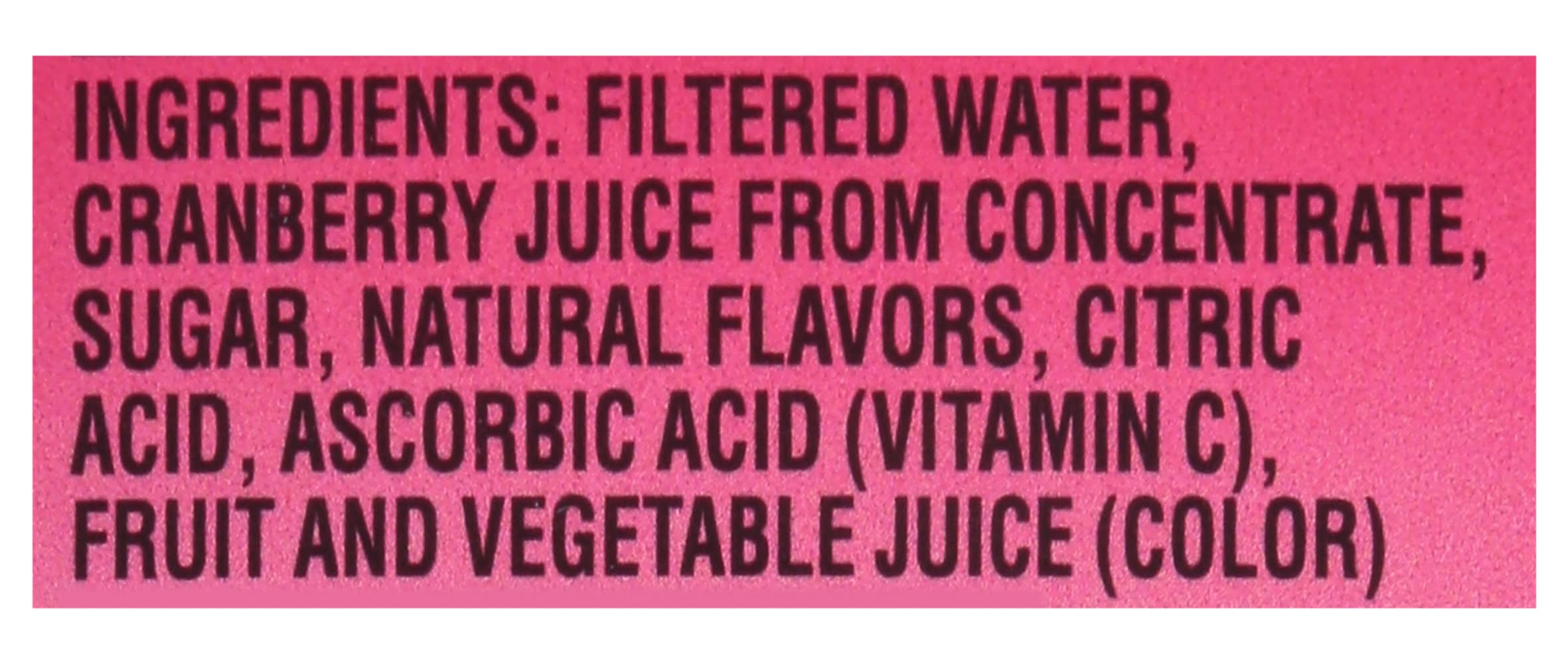 Ingredients: Filtered Water, Cranberry Juice from Concentrate, Sugar, Natural Flavors, Citric Acid, Ascorbic Acid (Vitamin C), Fruit and Vegetable Juice (Color)