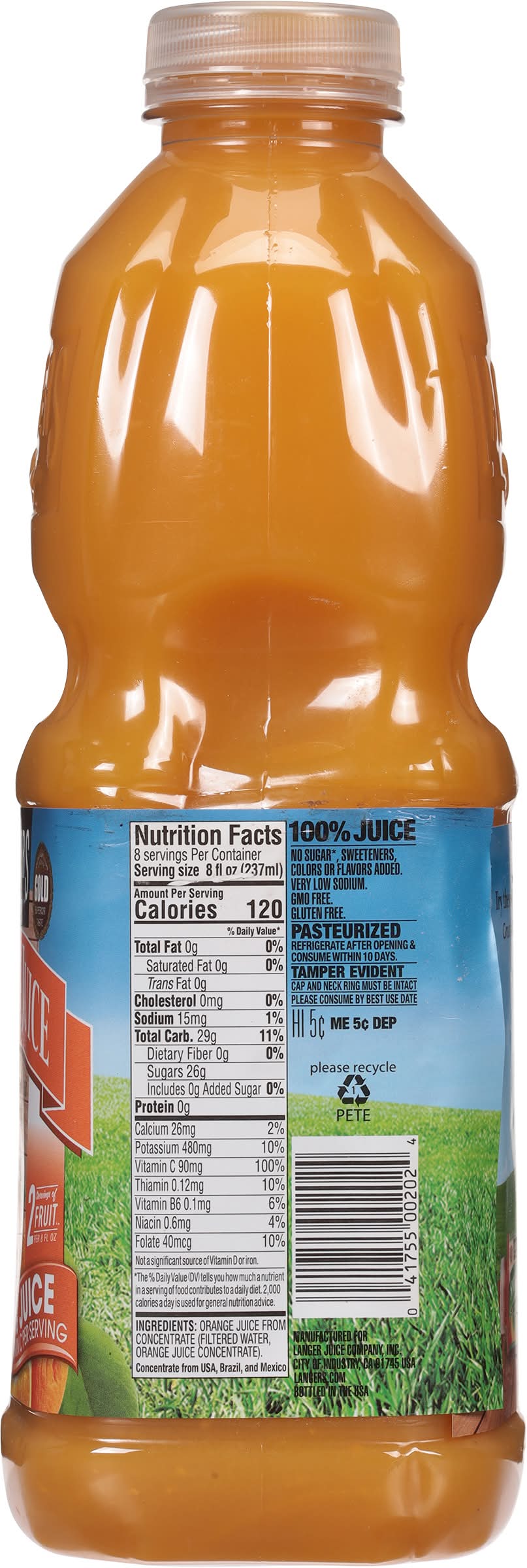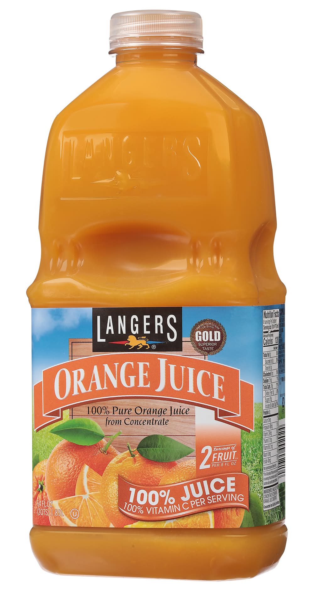 Langers 100% Orange Juice from concentrate is a very special blend of sweet Valencia oranges from California and Florida • Number of servings: 8 • Packaging: Reusable