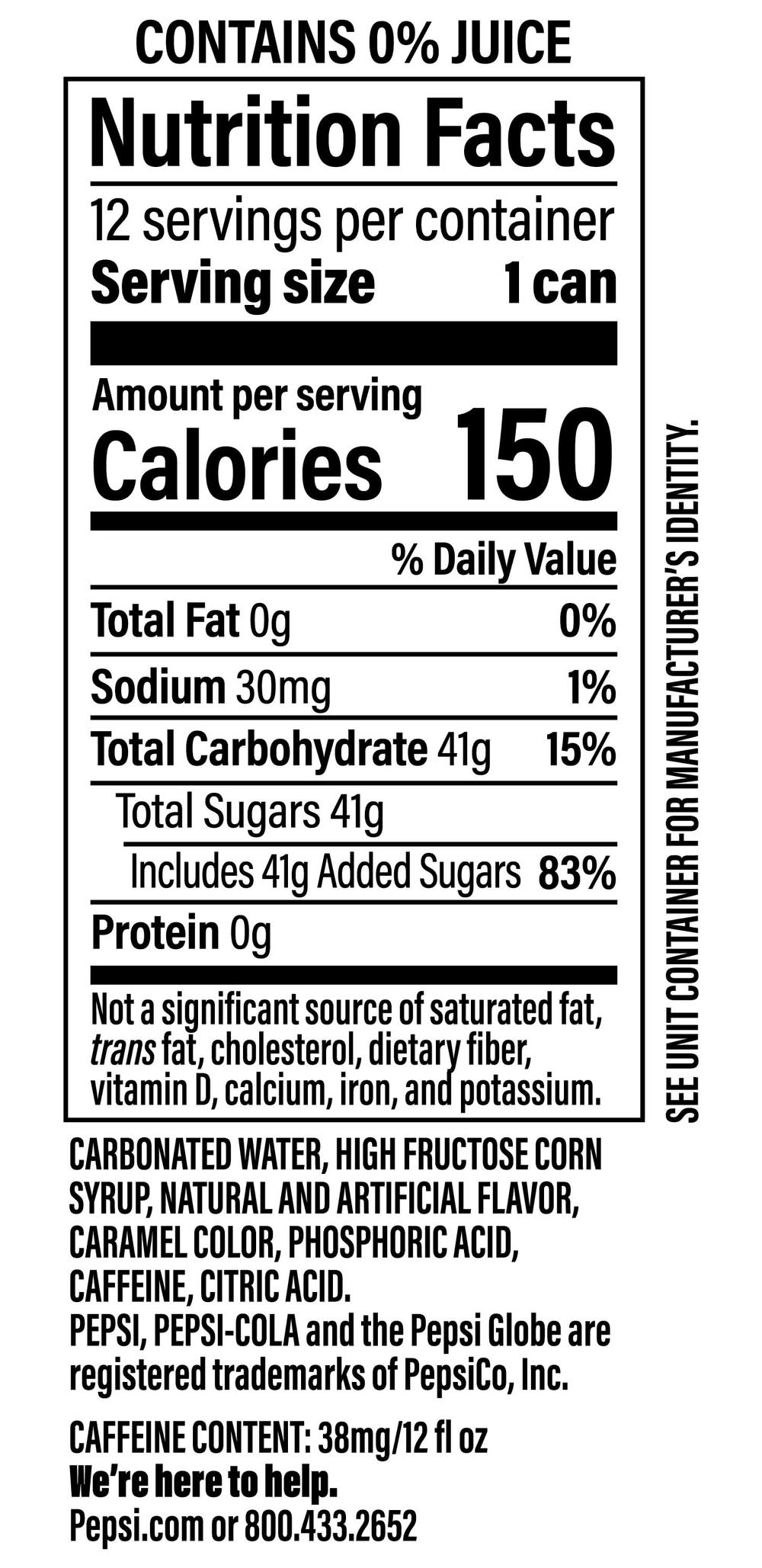 Ingredients: Carbonated Water, High Fructose Corn Syrup, Natural And Artificial Flavor, Caramel Color, Phosphoric Acid, Caffeine, Citric Acid