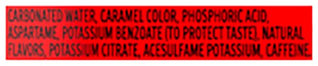 Ingredients: Carbonated Water, Caramel Color, Phosphoric Acid, Aspartame, Potassium Benzoate (to Protect Taste), Natural Flavors, Potassium Citrate, Acesulfame Potassium, Caffeine