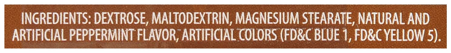 Ingredients: Dextrose, Maltodextrin, Magnesium Stearate, Natural and Artificial Peppermint Flavor, Artificial Colors (FD&C Blue 1, FD&C Yellow 5)