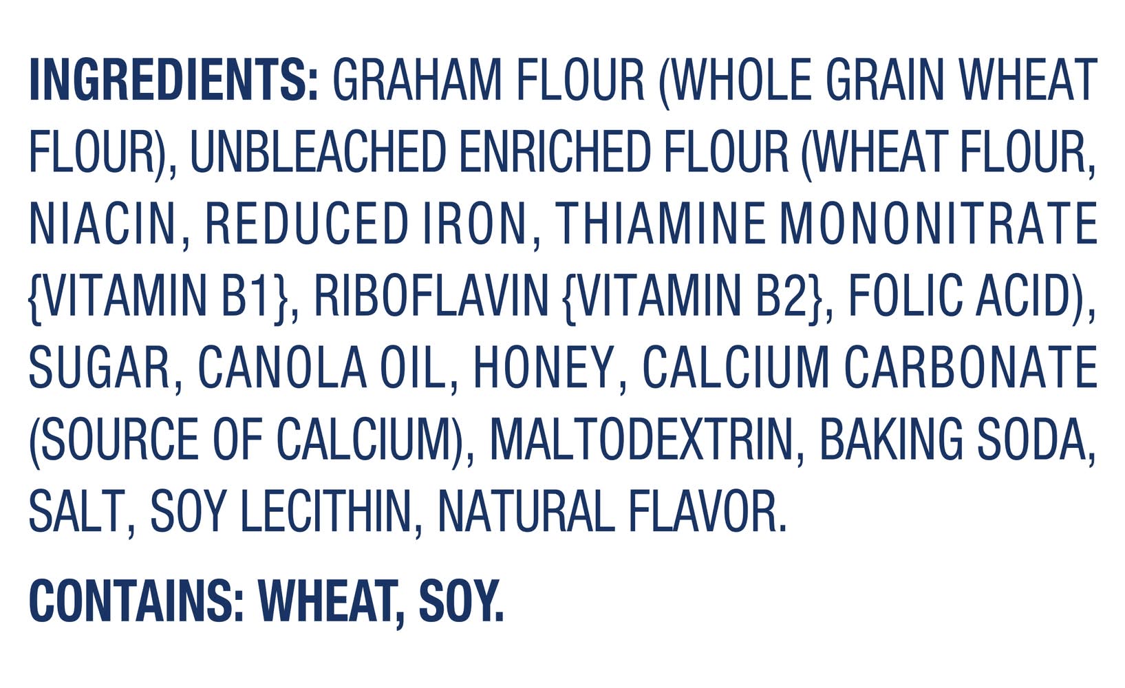Ingredients: Graham Flour (Whole Grain Wheat Flour) Unbleached Enriched Flour, (Wheat Flour, Niacin, Reduced Iron, Thiamine Mononitrate {Vitamin B1}, Riboflavin {Vitamin B2}, Folic Acid) Sugar Canola Oil Honey Calcium Carbonate (Source of Calcium) Maltodextrin Baking Soda Salt Soy Lecithin Natural Flavor. Contains: Wheat Soybeans