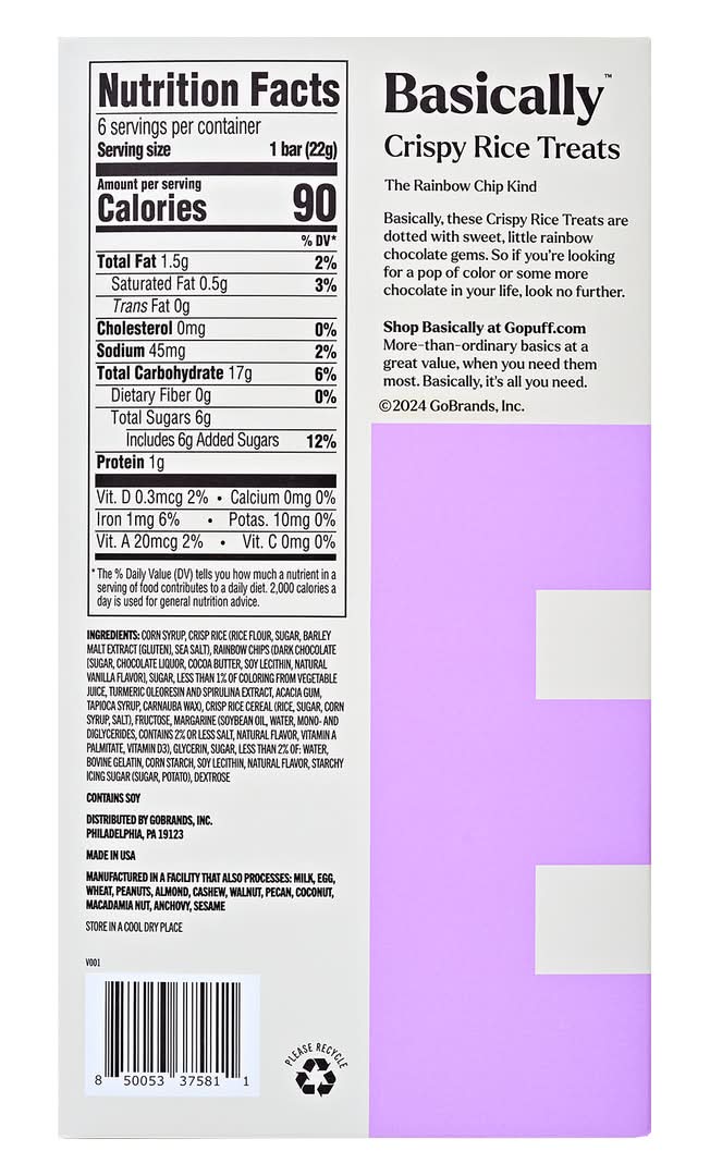 Basically, these Crispy Rice Treats are dotted with sweet, little rainbow chocolate gems. So if you're looking for a pop of color or some more chocolate in your life, look no further. What makes them great: -Perfect grab and go snack -6 bars per box Good to know: -Made in the USA More-than-ordinary basics at a great value, when you need them most. Basically, it's all you need.