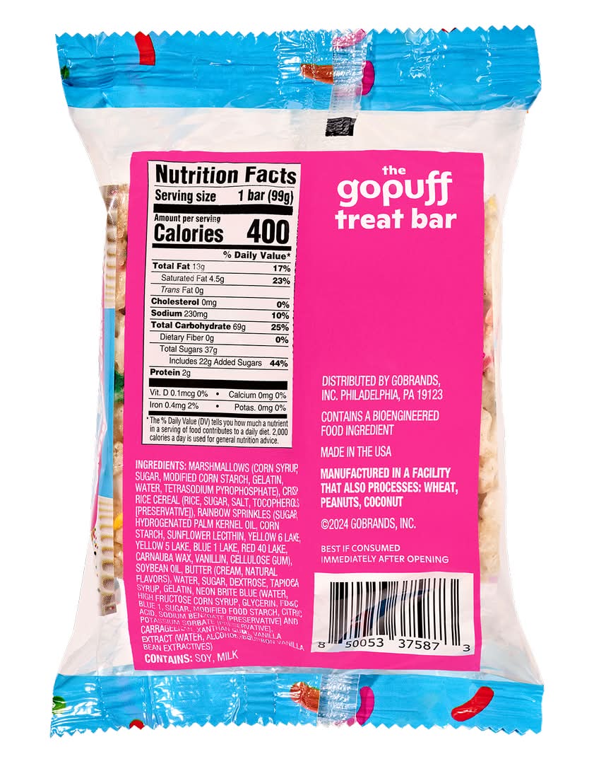 Who says you need a reason to celebrate? Our Birthday Cake Treat Bar brings the party to your mouth with every crispy, gooey bite. Topped with blue marshmallow fluff and a party of rainbow sprinkles, it’s time to treat yourself—no candles necessary! - Rainbow sprinkles galore for a pop of fun - Topped with blue marshmallows for a colorful twist - Birthday Cake makes any day special - Gopuff Exclusive