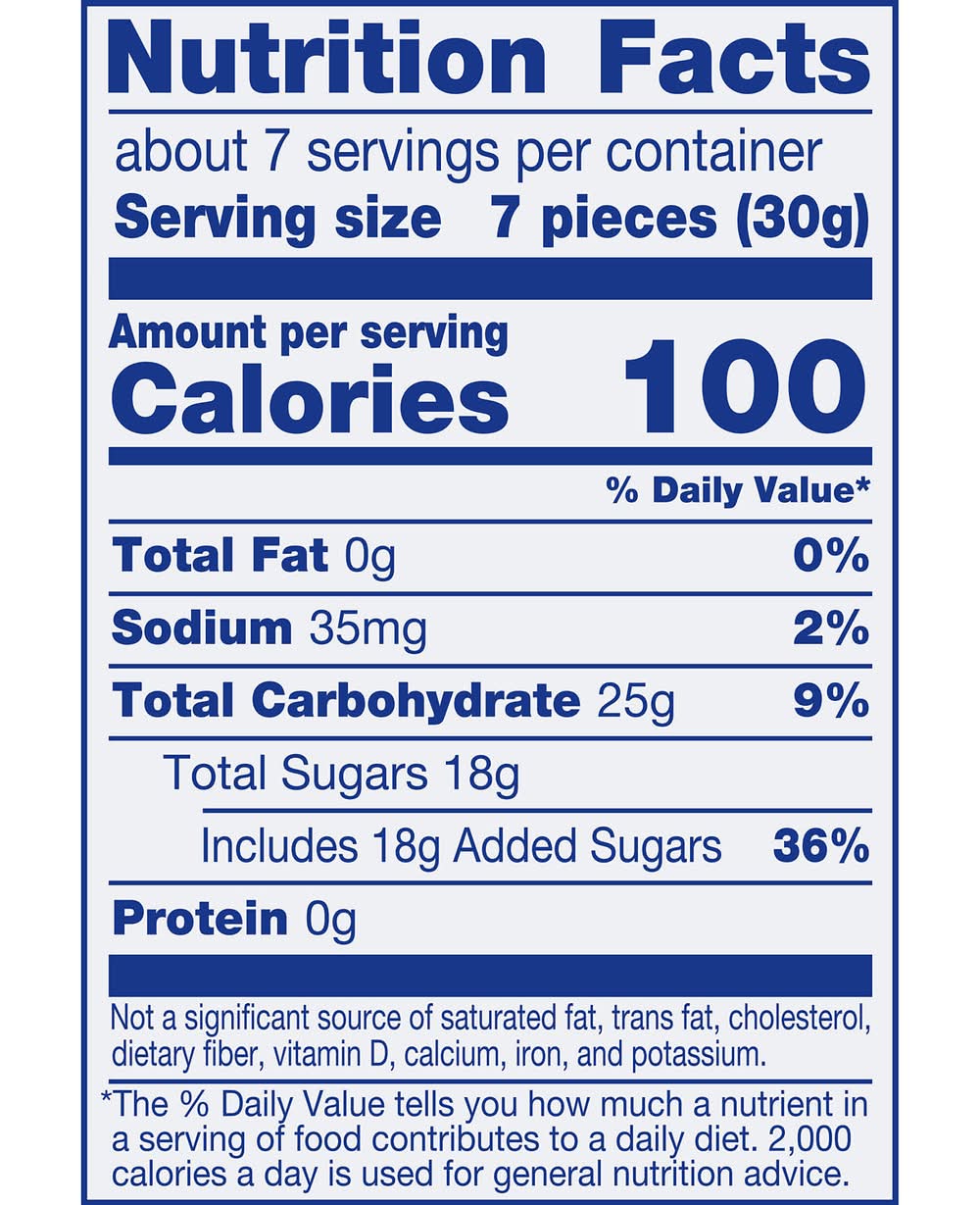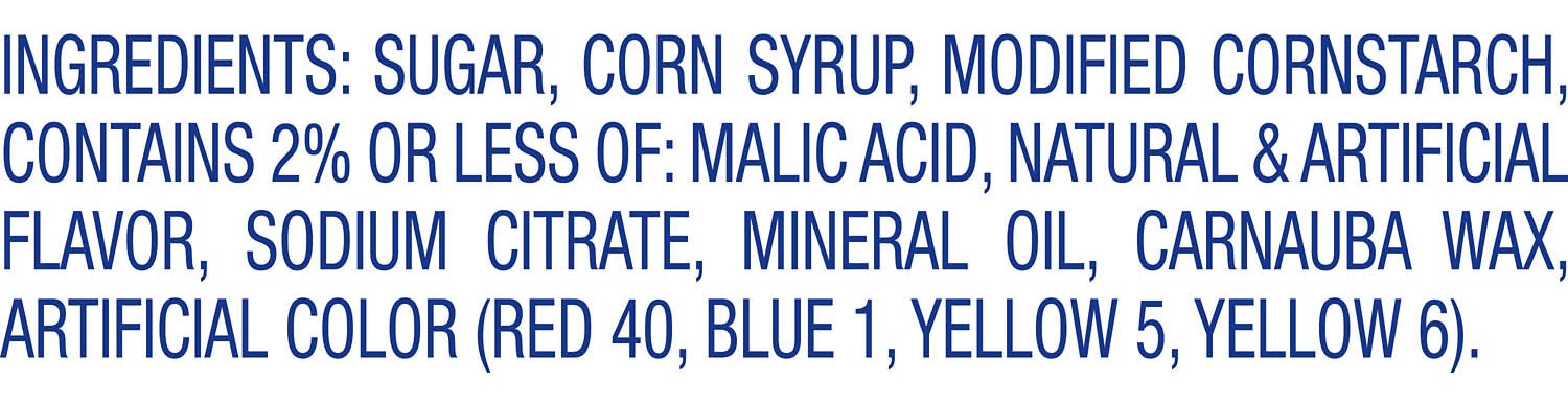 Ingredients: SUGAR, CORN SYRUP, MODIFIED CORNSTARCH, CONTAINS 2% OR LESS OF: MALIC ACID, NATURAL ARTIFICIAL FLAVOR, SODIUM CITRATE, MINERAL OIL, CARNAUBA WAX, ARTIFICIAL COLOR (RED 40, BLUE 1, YELLOW 5, YELLOW 6), . Contains: Contains: Does Not Contain Any Of The 8 Major Allergens